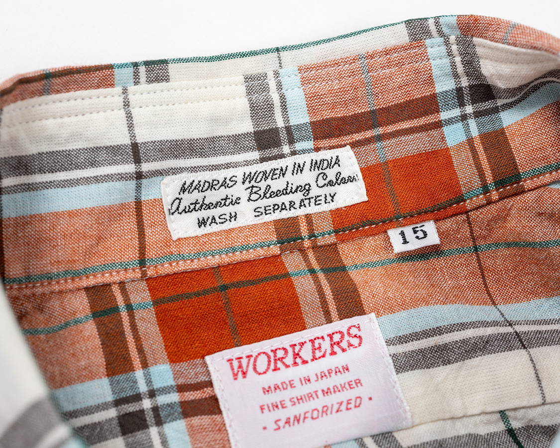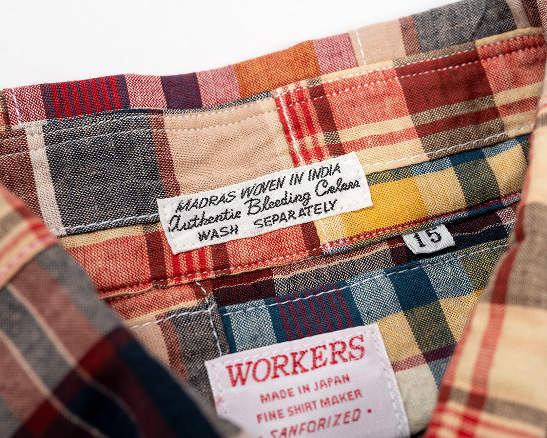 マドラスはおなじみ「インド製です!色が滲みます!」ネーム。正直、昔のマドラスほどにじみませんが、それでも、堅牢度(色の定着度)は日本の生地より悪いので、注意書き兼、マドラス感も出るのでネームをつけています。