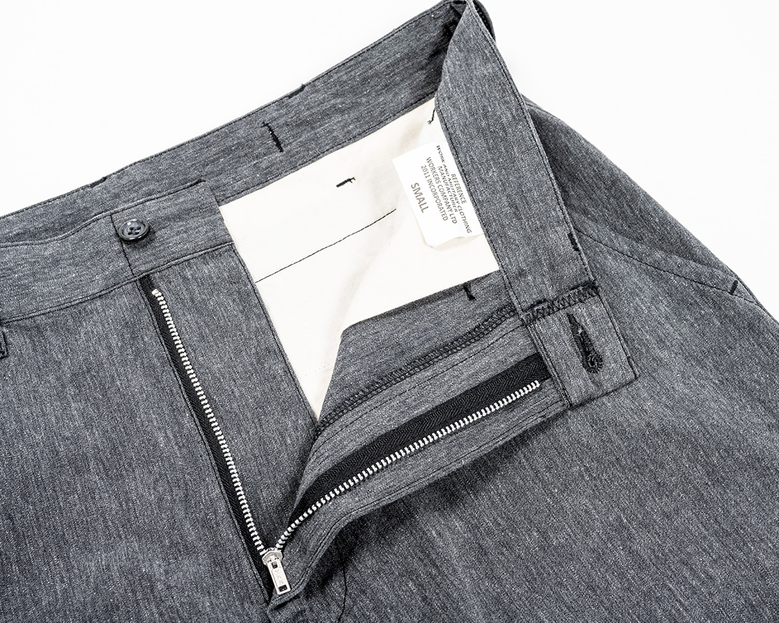 フロントはYKKのジッパー。以前はYZIPを使っていましたが、そちらが廃番になり、同サイズのカムロックジッパーに。もともと、ミリタリーショーツについていたRAPIDのファスナーに近い形を探していて見つけました。小さい分、精密さ・物自体に強度が求められるのでYKKから探しています。