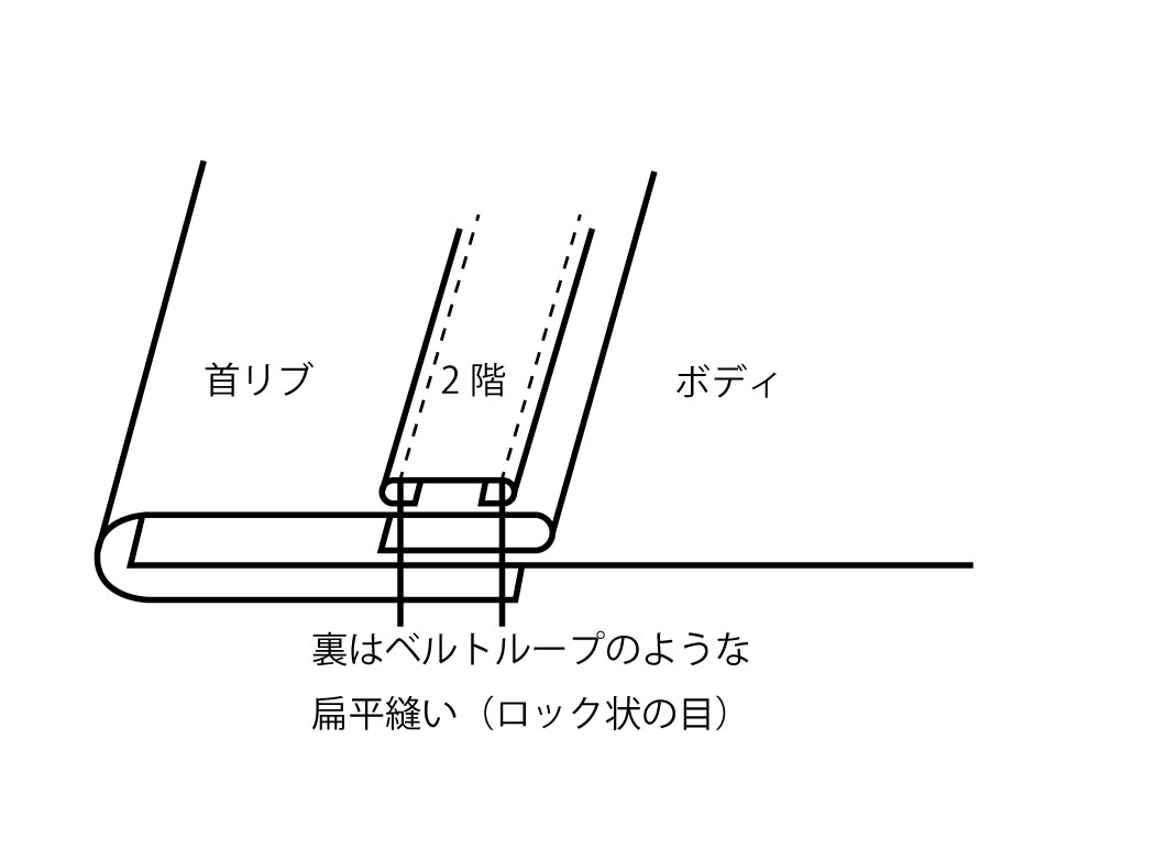 ボディを首リブで挟み込み、さらに、その首リブの上に2階部分がリブで乗る。そして2本針で一気に縫う。針落ち部分の生地厚みの違い、さらに直線ではなくボディは首回りでカーブしている。ということは、内回り・外回りは距離が違う。でも目が飛んではいけない。
