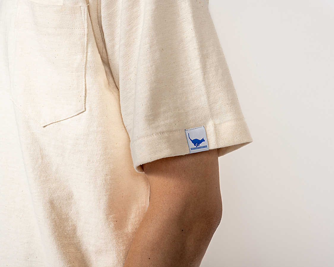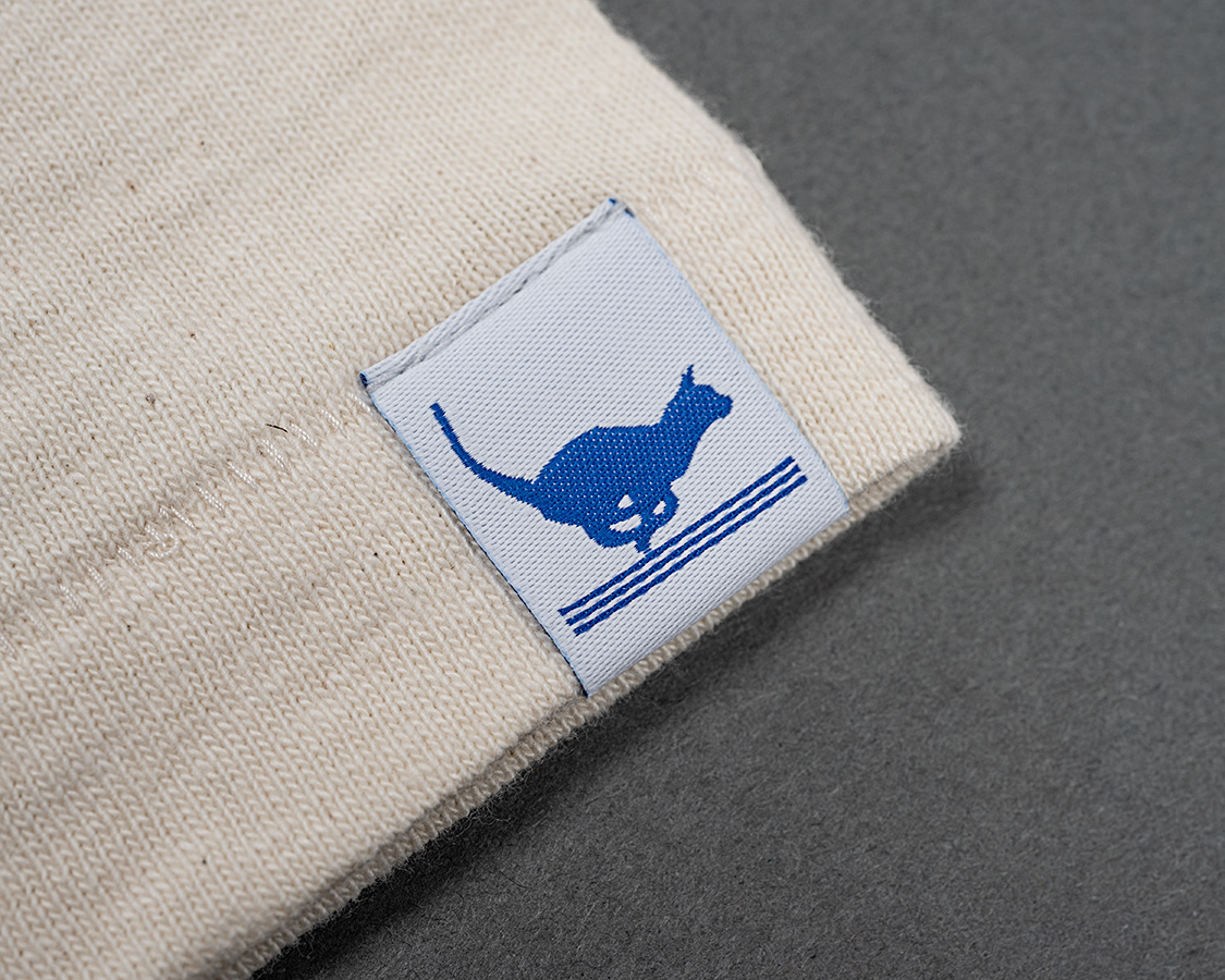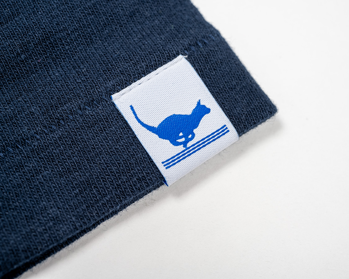 左袖にはランニングキャットネーム。今まであまり外から見てわかるネームはつけませんでしたが、我ながら、Tシャツもよいものが作れるようになった!と自負でつけてみました。ただ、高かった!超高密度織りでこそ再現できている猫のエッジが見どころ。