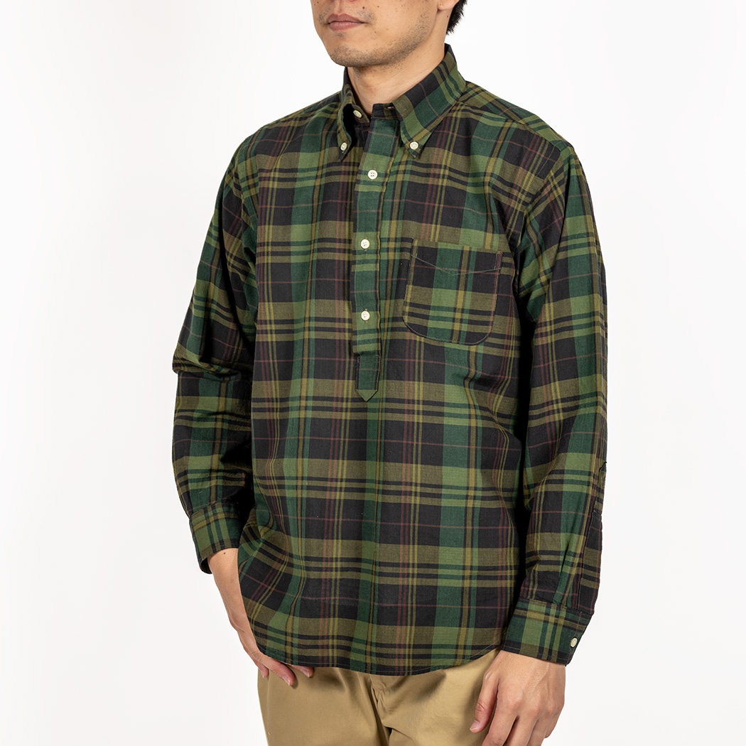 シルエットはModified Fit を元にしつつ、脇の絞りを無くしゆったりとした着心地に。 プルオーバーは前が開かないので体が動いた時に突っ張る感じが出ると着にくいので。