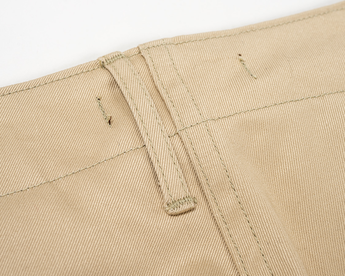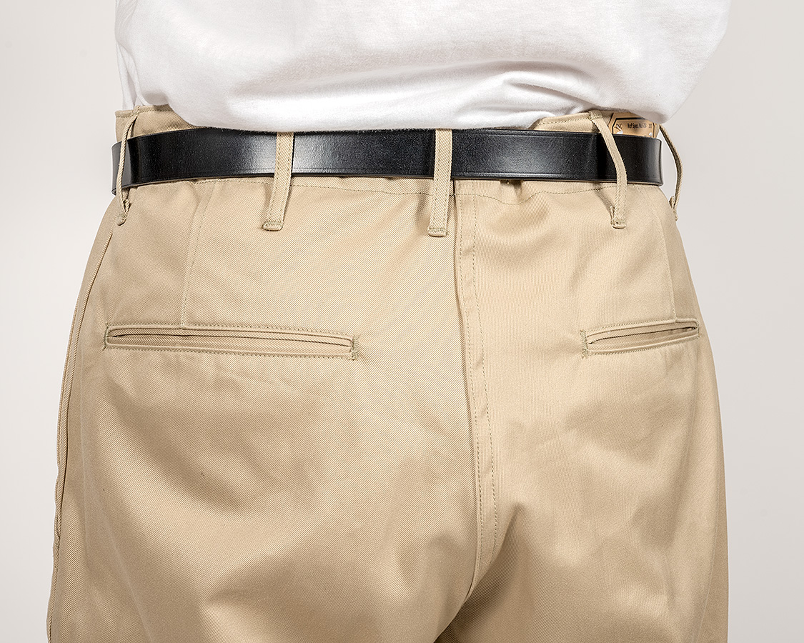 背面、左右にタックでヒップの丸みを出す。左右の細玉はどうしても口が少し開きます。これが古着のチノパンっぽくもある部分。