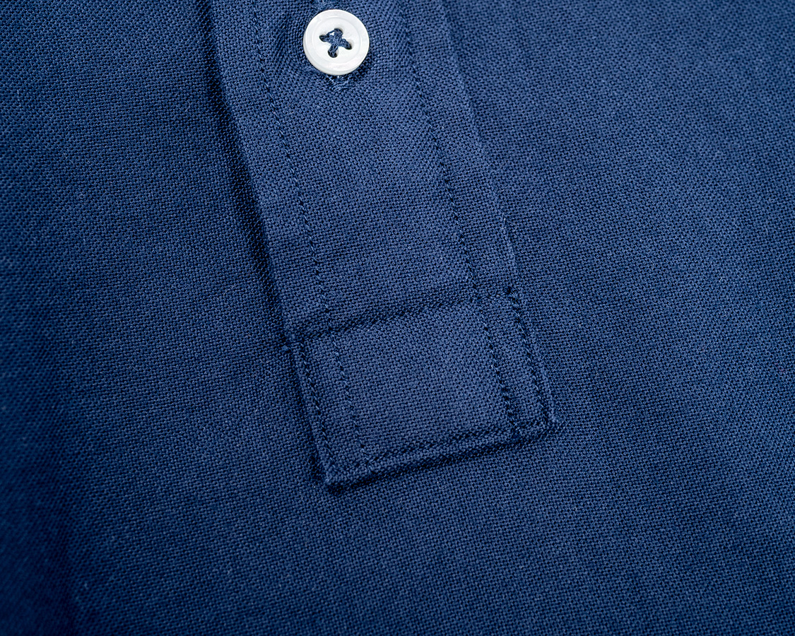 前立ての下側。プルオーバーのボタンダウンだと剣ボロのようにとがった形にするところ、あくまで「ポロ」なので角型。