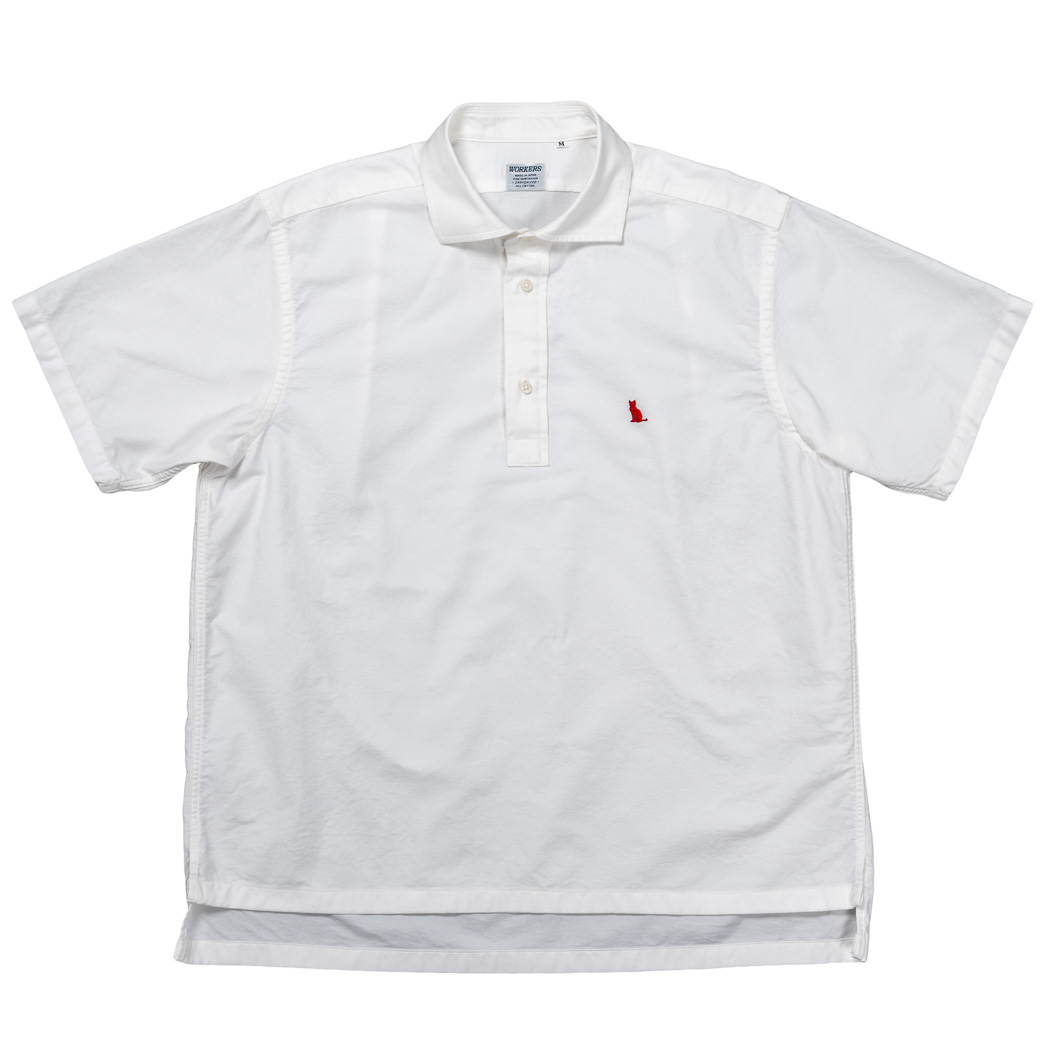 悩んだのが襟。ポロシャツは編み立てた1 枚襟を身頃に取り付け、縫い代はテープで隠す始末。それを真似ようかとも 思いましたが、せっかくシャツならシャツらしい仕立てができる。ポロシャツのイミテーションでは意味が無い。あくま で要素として取り入れ「ポロシャツの襟、シャツ仕立てだと何が一番近く見えるかな?」と考えると・・・ワイドスプレッ ドが一番近い。ボタンダウンも一瞬考えましたが、それだと、プルオーバーBD と同じようになってしまうのでワイドスプレッドで決定。