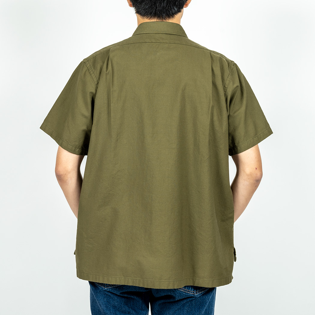 身頃はMサイズで60センチ程とゆったり。背面のサイドタックで横幅を出しています。着丈、73センチ程。ポロシャツよろしく前が短いデザインなのでタックアウト前提。