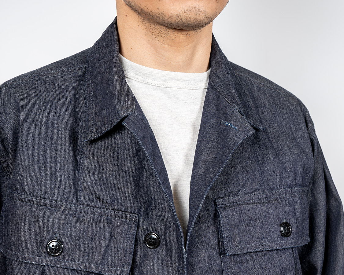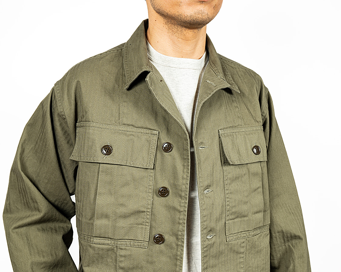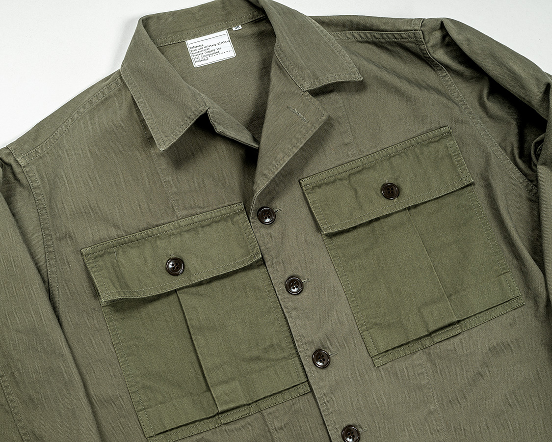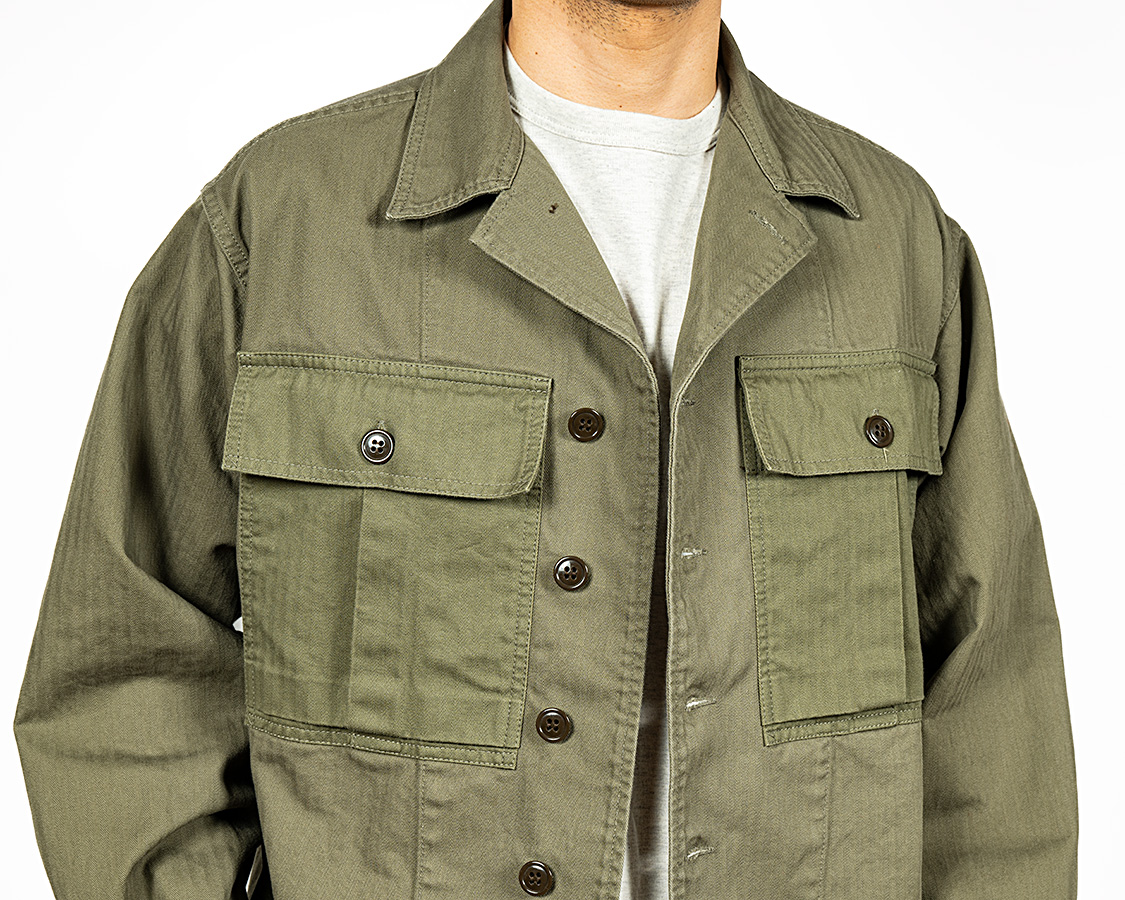 2-Toneは胸ポケットだけヘリンボンでも色味が違う、別生地で作っています。ミリタリーで見かける「色ぶれちゃってるけど、道具として使うには問題ないだろう」をデザインに活かした仕様。
