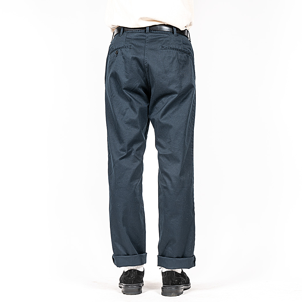 尻繰りはダブルステッチ巻き縫い、脇・内またはインター ロック。強度優先の縫製でラフに穿けるストレートシルエットのチノパンを目指しました。