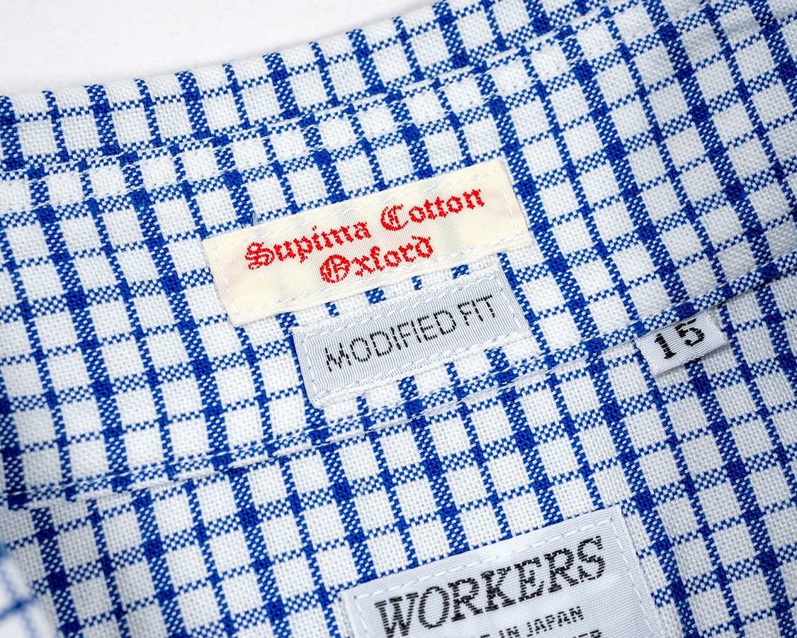 メインのネームは古着のARROW風。そこにフィットネームとスーピマオックス生地には材料ネーム。このガチャガチャ色々ついてるのが、古着で見たあのアメリカのシャツを思い出します。