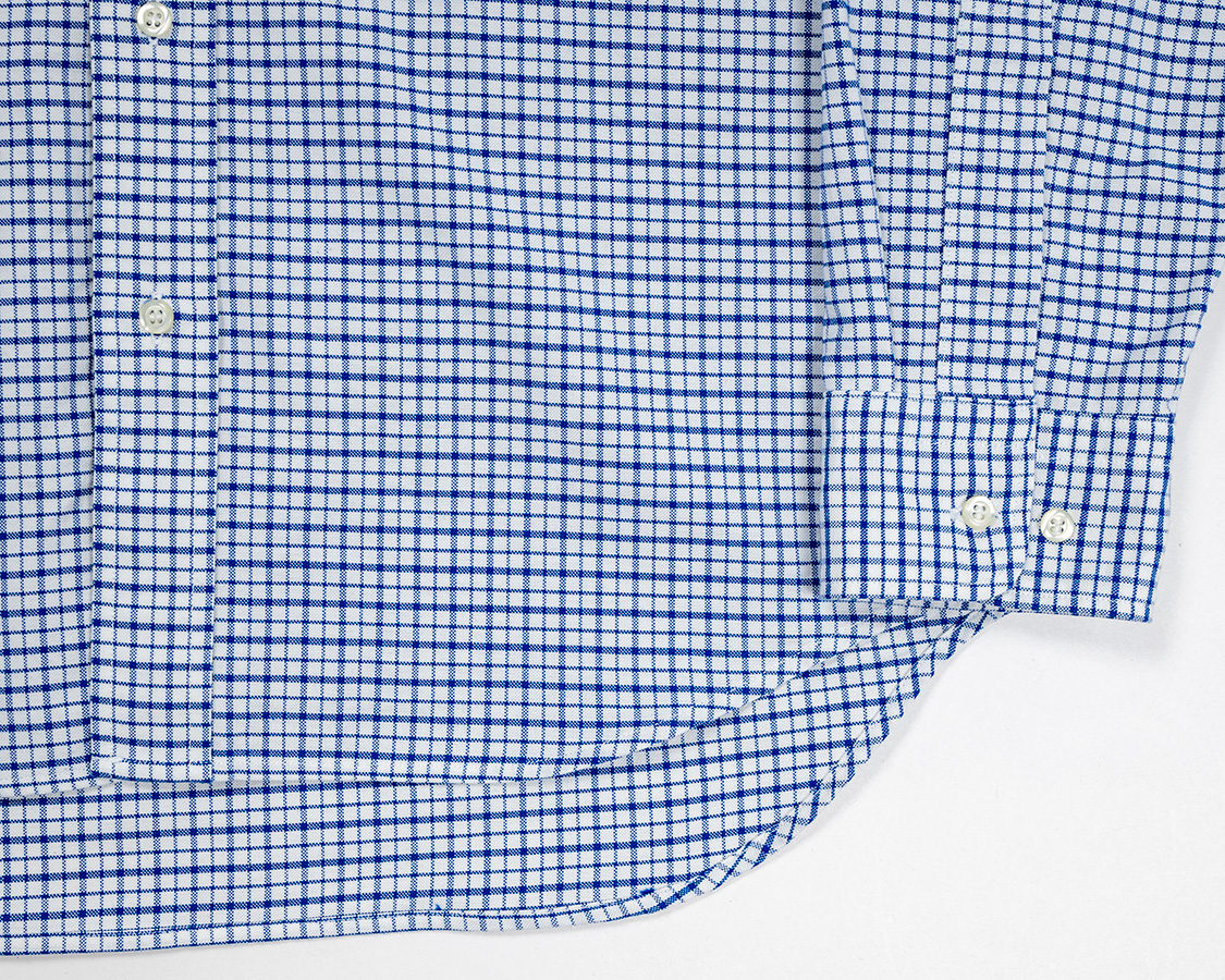 開きの裏、ぜひお手元に届いたら見てください。切りっぱなし部分がありません。これもパターン+縫いの仕様です。アメリカ物のボタンダウンでこのうまい仕様を見つけて真似た部分。作り方が気になる方は解体してみると、縫い代が独特な入り方して「難しい!」というのがわかります。 |