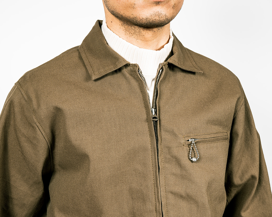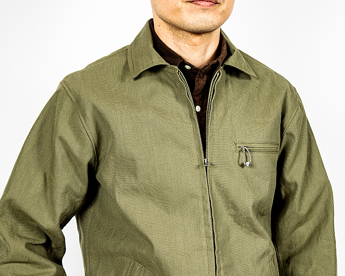 小ぶりで四角い襟。ファスナーを上まで閉めると襟が左右に開いたように見えます。ビンテージの213とか、ふる~いGジャンの襟型から想像した形。