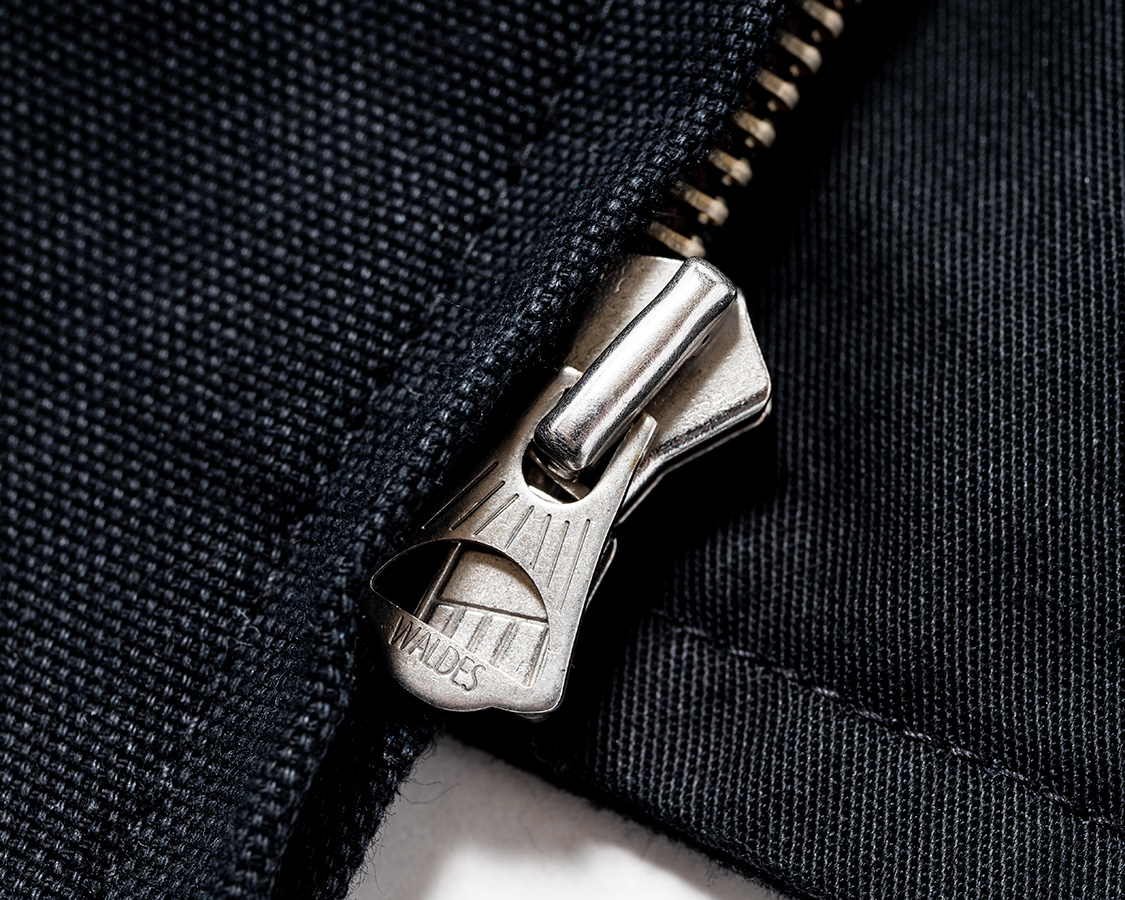 ファスナーは朝日のTALON「風」オートマチック。エンドボックスと引手が右身頃側に来る、いわゆる「アメリカ式」の差し込み位置。
