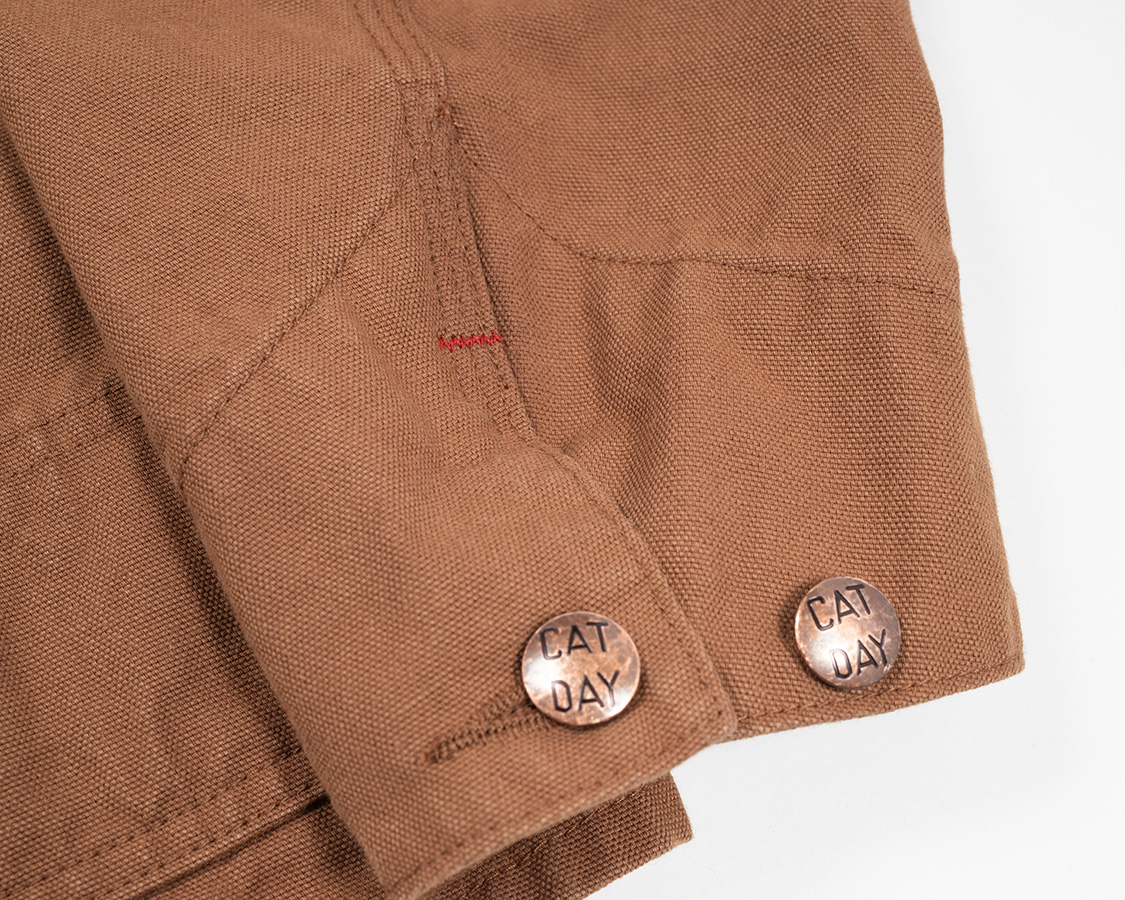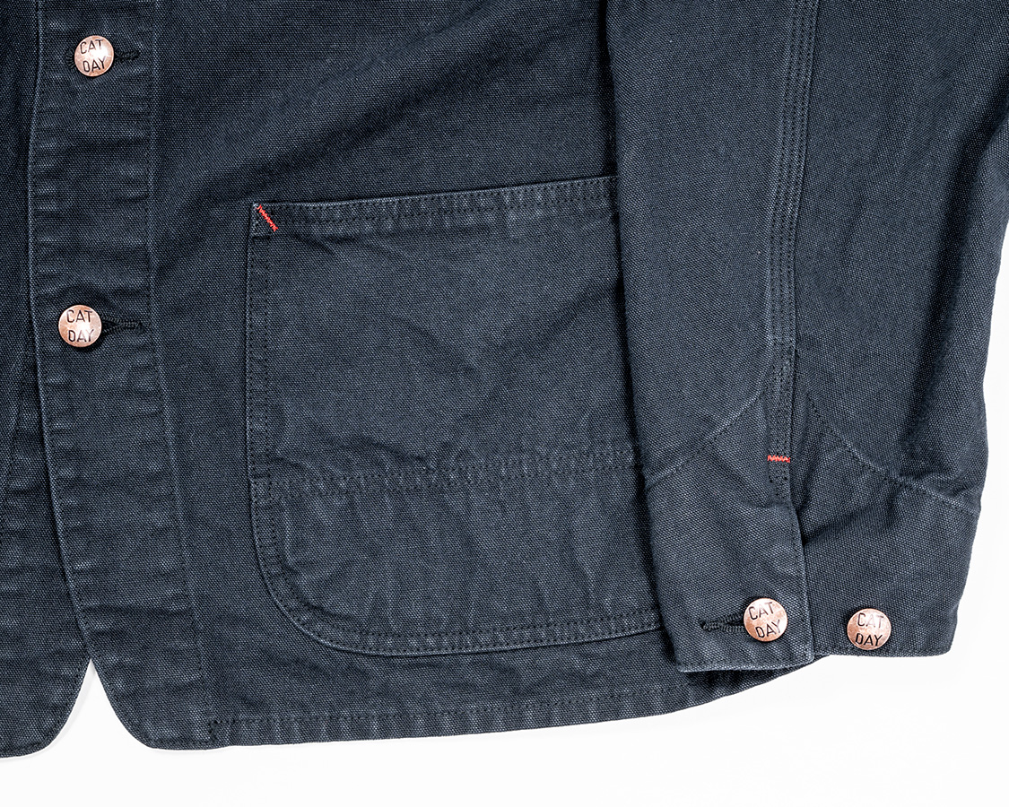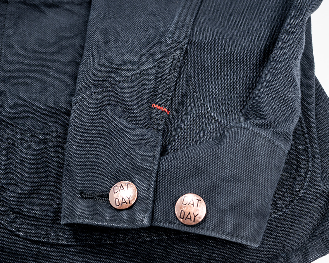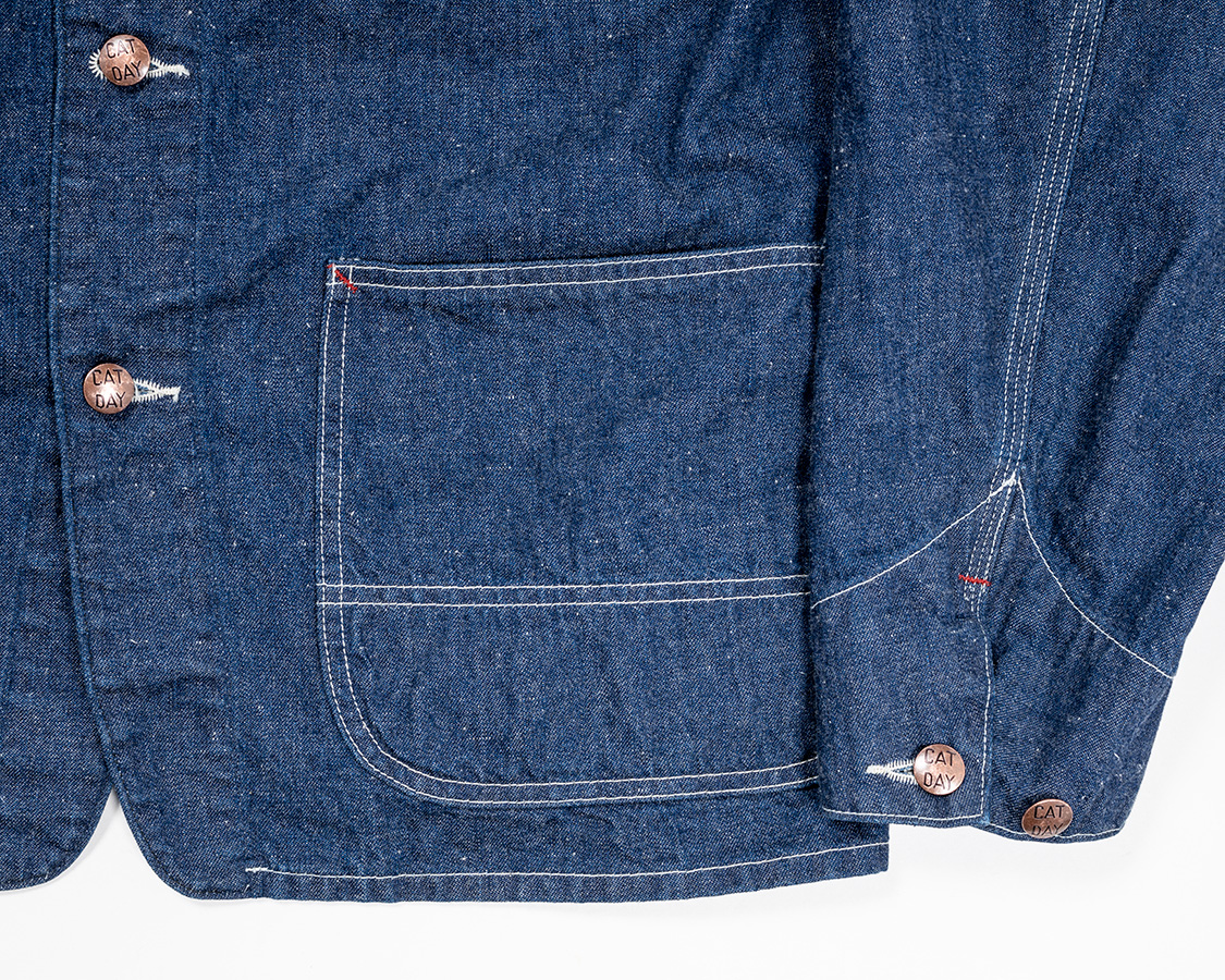 これも若かりし頃に見てもよくわからなかった始末。カフスがついているのに比べると、ある意味複雑といえば複雑。でもカバーオールというと、この見返し+調整ボタン。袖の縫い合わせの突端はカンドメで補強、が定番です。