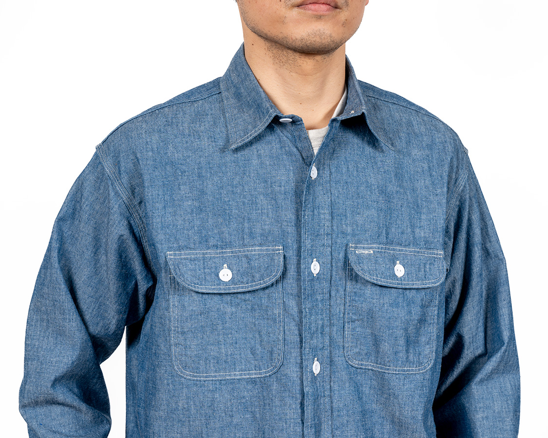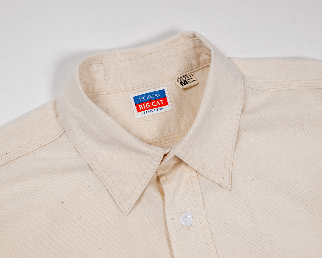 少し落ち気味の肩、ゆったりした身頃。一時代前のぱっつぱつとは違う、かといって若い子達が着る肩が落ちまくったのとも違う。ベーシックなワークシャツのサイズ感。