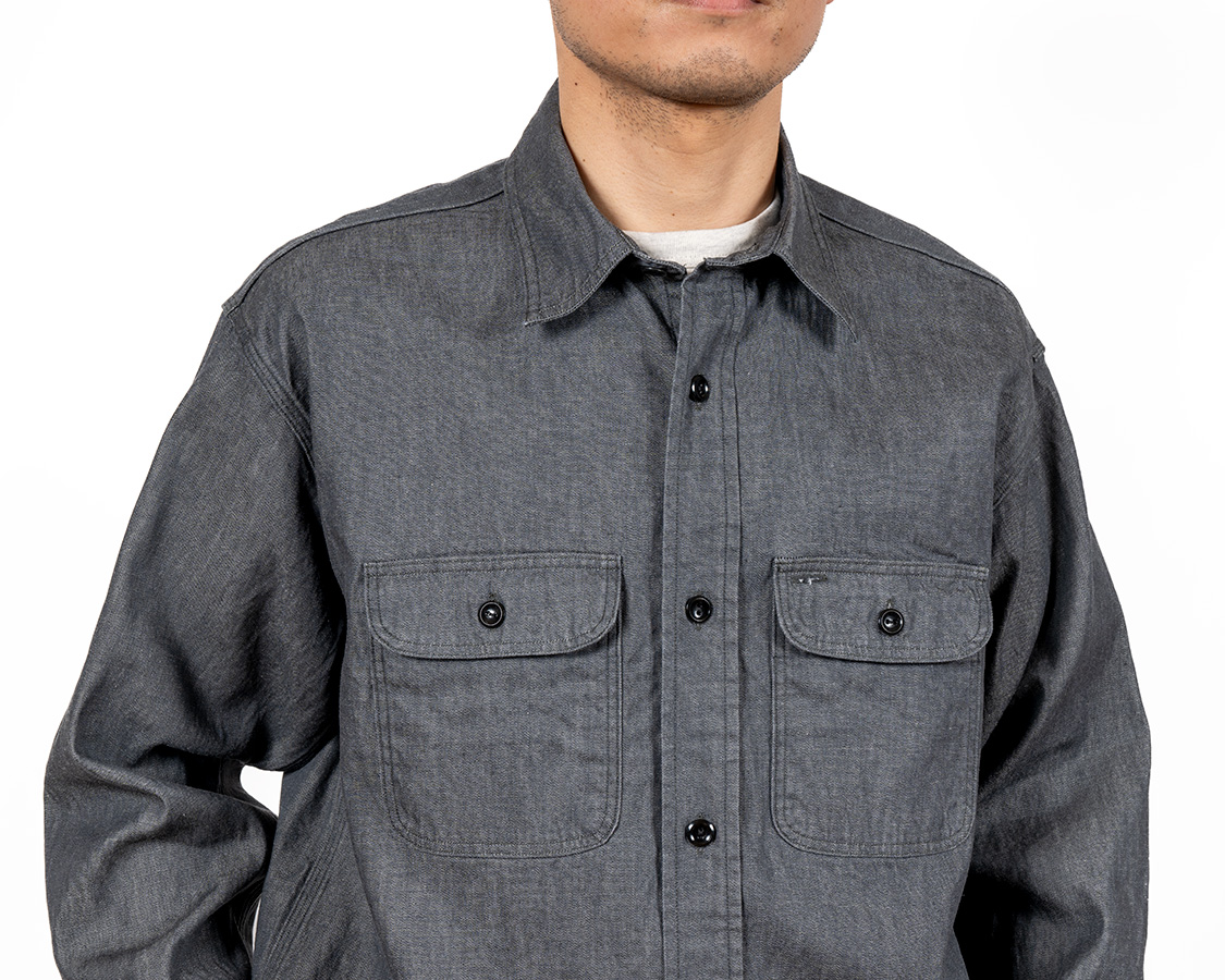 ネックは台襟+羽襟。チンストは無し。MILTON F GOODMAN Shirtのような超豪華系ではなく、もっと後の年代の「地味、でも今見ればすごくよくできている」ワークシャツを目指しています。こういうシャツも昔はそれこそ数千円から、1-2万出せばビンテージが買えましたが、今は無理なので作りました。