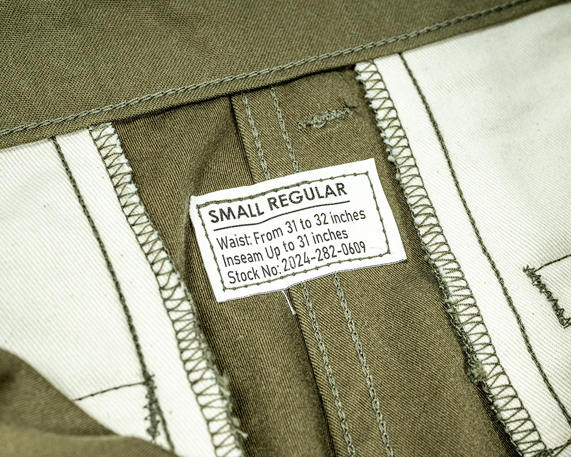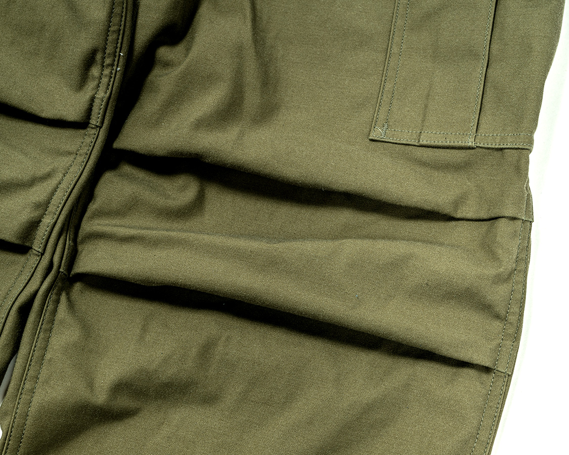 膝タック。どこまで機能的な意味があるか微妙ですが、「軍パンといえば」の仕様。縫う側としては、脇・内またを巻き縫いするときにこのタックが大変邪魔です。