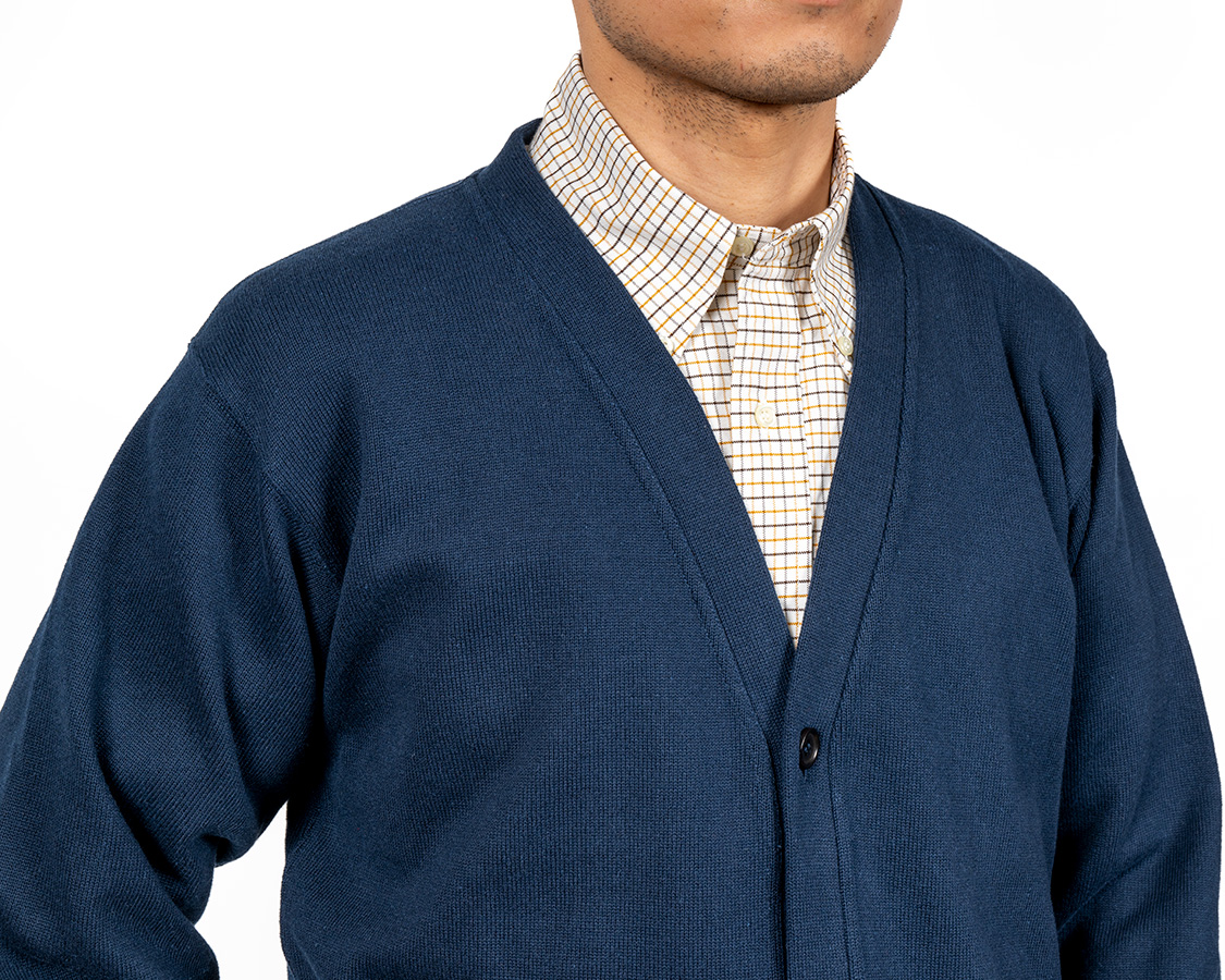 前Vは深すぎず、浅すぎず。中にボタンダウンを着て襟先のボタンがぎりぎり隠れるかどうかというライン。サイドネック(首の左右)はある丸首より少し沿うように。