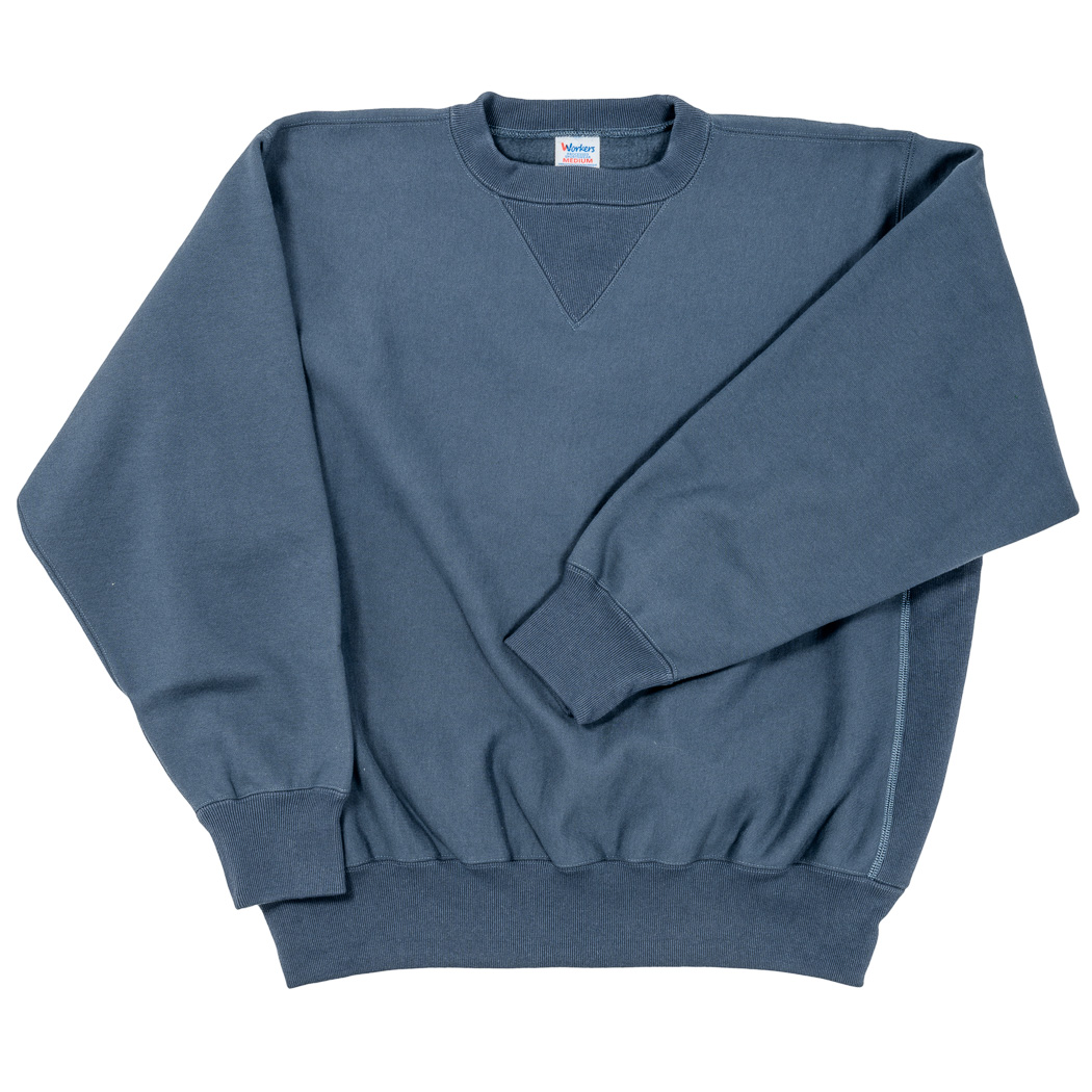 本家は化繊入り・カサッとしたスウェット生地に対し、WORKERS は表30番・中30番・裏7番の綿100。裏の糸ループを短く編み、 さらに起毛をかけた本格的冬用スウェットです。