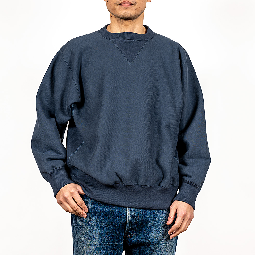 18ゲージでガチガチに目を詰めて編んでいるので形崩れしにくい。重さ15 オンス程あり、いわゆる「超ヘビーウェイトスウェット」。でも化繊は使っていないのでしなやか。