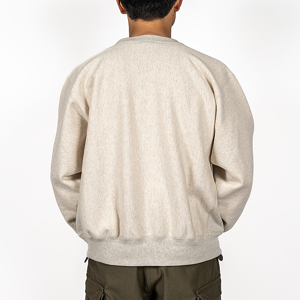 18ゲージでガチガチに目を詰めて編んでいるので形崩れしにくい。重さ15 オンス程あり、いわゆる「超ヘビーウェイトスウェット」。でも化繊は使っていないのでしなやか。