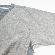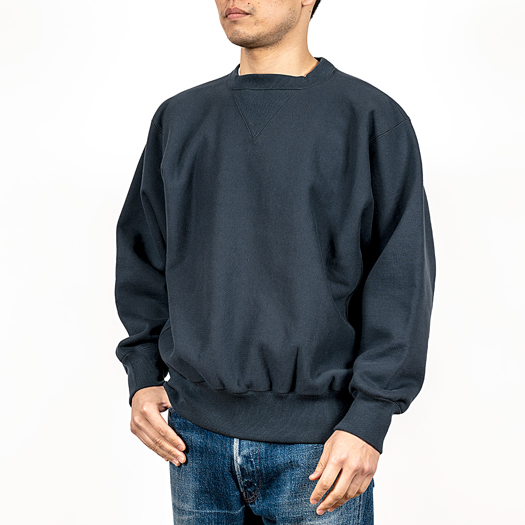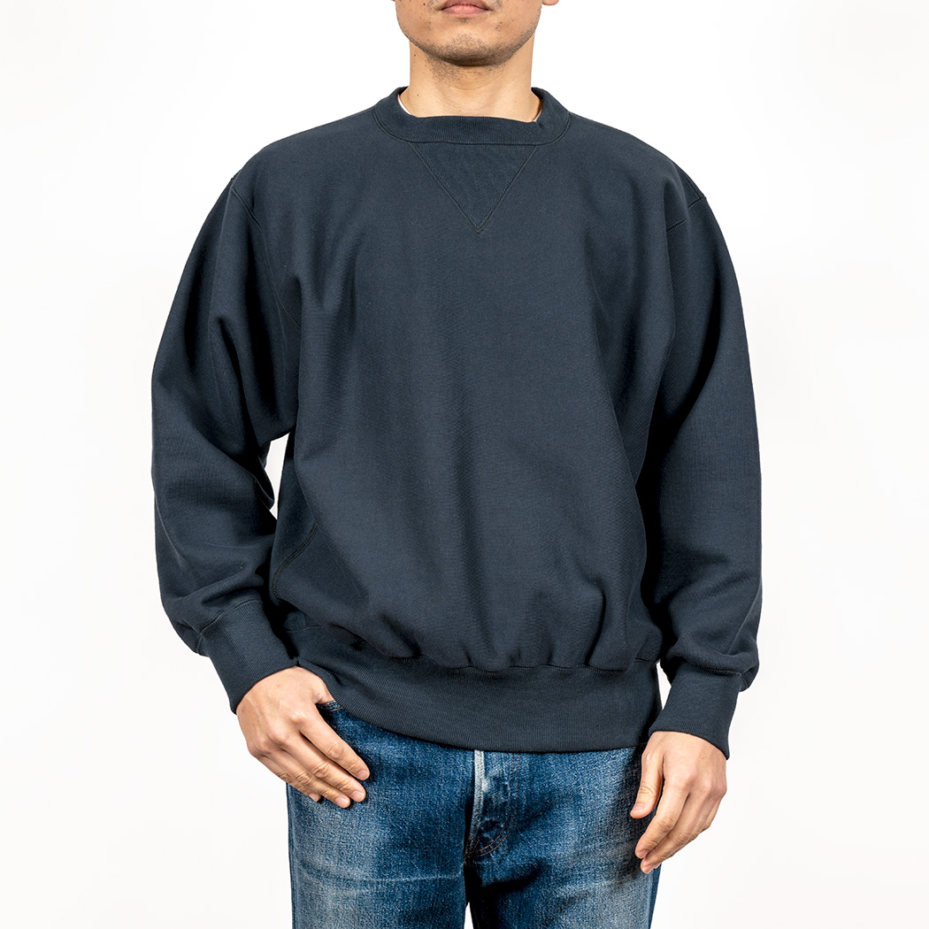 18ゲージでガチガチに目を詰めて編んでいるので形崩れしにくい。重さ15 オンス程あり、いわゆる「超ヘビーウェイトスウェット」。でも化繊は使っていないのでしなやか。