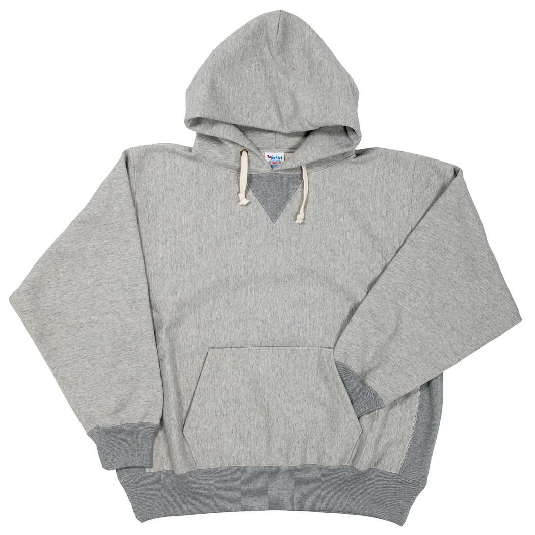 本家は化繊入り・カサッとしたスウェット生地に対し、WORKERS は表30番・中30番・裏7番の綿100。裏の糸ループを短く編み、 さらに起毛をかけた本格的冬用スウェットです。