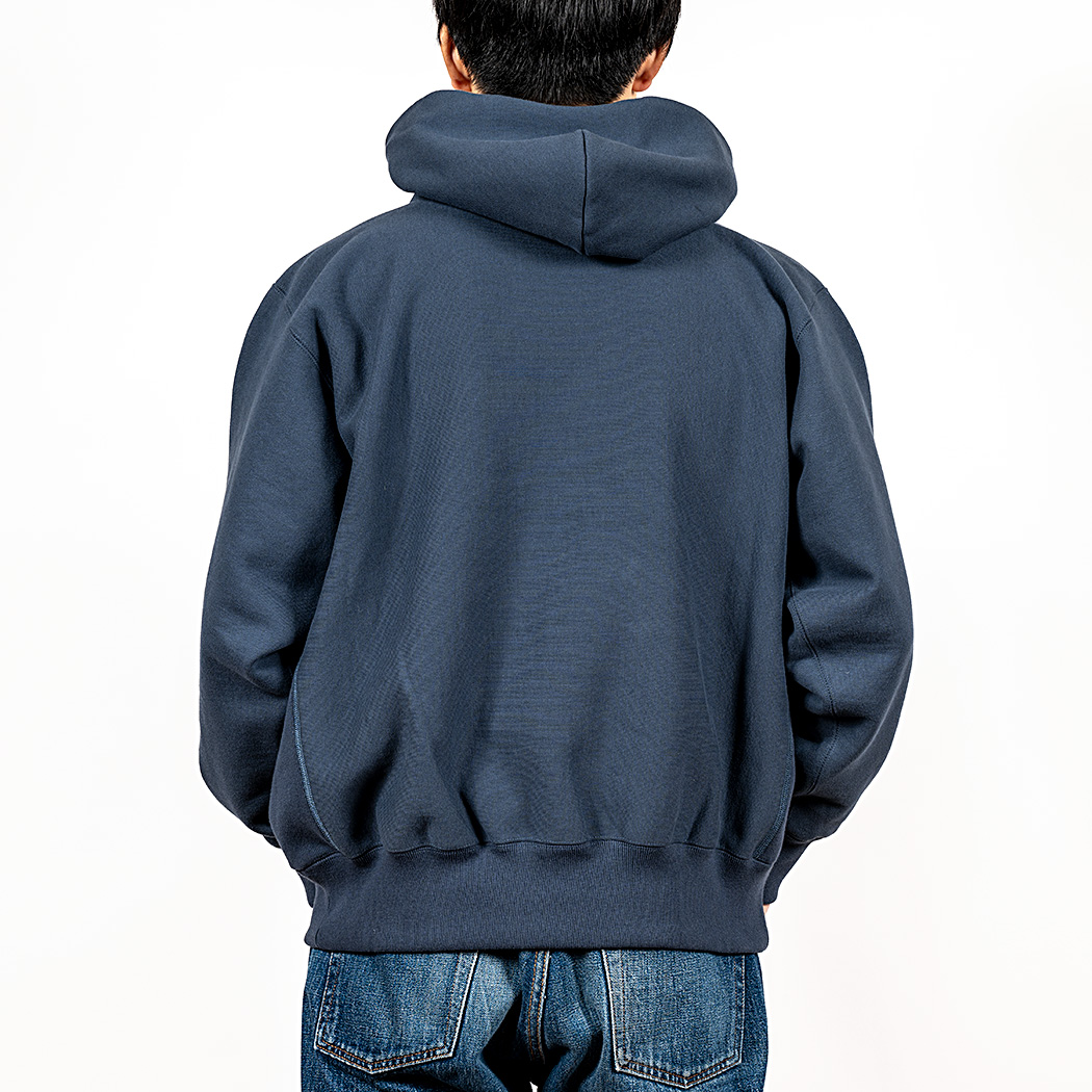 本家は化繊入り・カサッとしたスウェット生地に対し、WORKERS は表30番・中30番・裏7番の綿100。裏の糸ループを短く編み、 さらに起毛をかけた本格的冬用スウェットです。