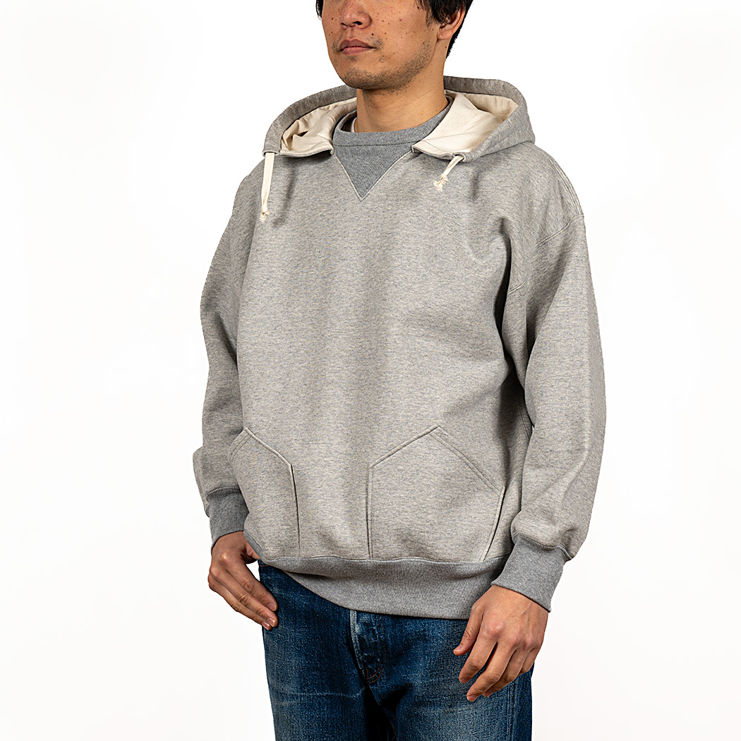 ビンテージを色々見ていたら発見した仕様。おそらく、フード裏までボディと同じ裏毛だと厚みがありすぎて洗濯したと き本当に乾きが悪い。そのあたりを解消するためにフード裏だけは別生地にしたのだと想像しています。
