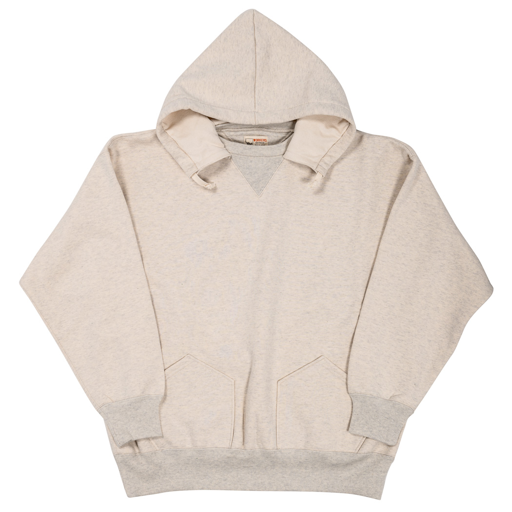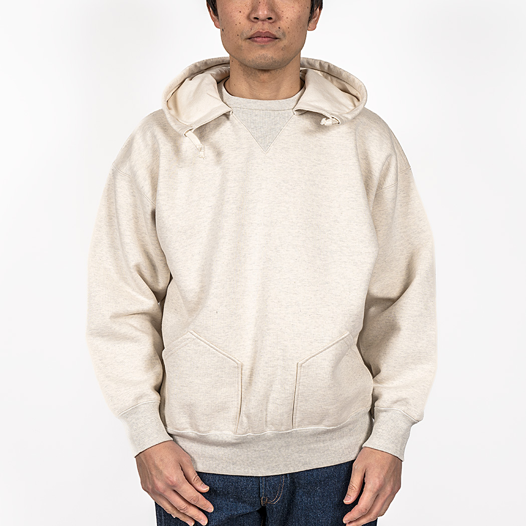 ビンテージを色々見ていたら発見した仕様。おそらく、フード裏までボディと同じ裏毛だと厚みがありすぎて洗濯したと き本当に乾きが悪い。そのあたりを解消するためにフード裏だけは別生地にしたのだと想像しています。