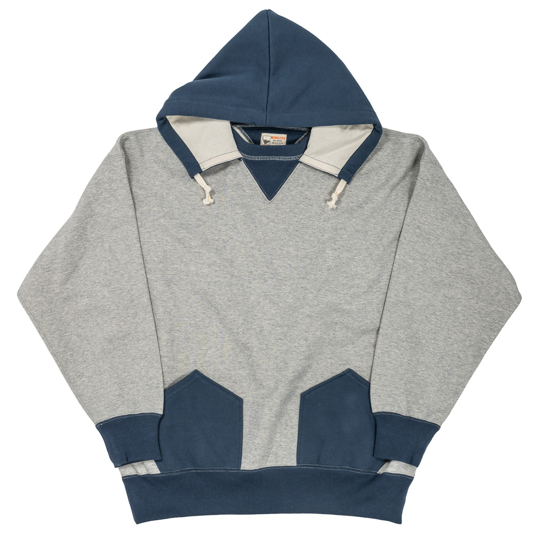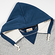 ビンテージを色々見ていたら発見した仕様。おそらく、フード裏までボディと同じ裏毛だと厚みがありすぎて洗濯したと き本当に乾きが悪い。そのあたりを解消するためにフード裏だけは別生地にしたのだと想像しています。