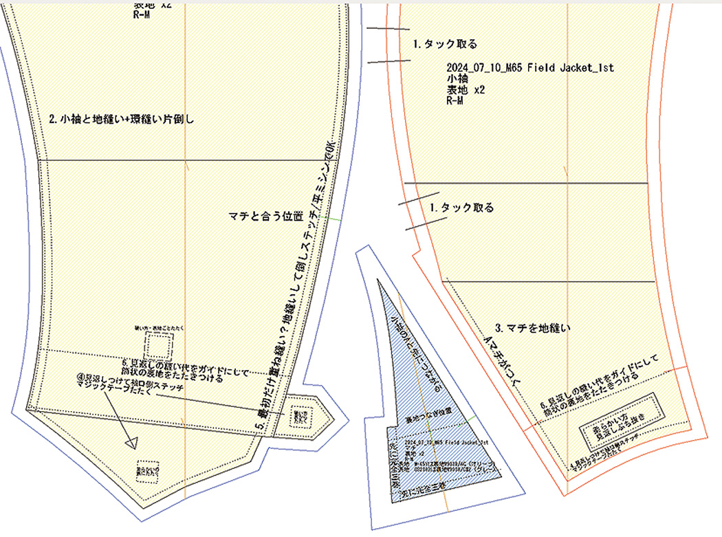 オリジナル解体で一番難しかったのが袖口部分。パターンのしつこいまでの書き込みを見てください。袖口に三角マチがつくのが特徴。別布でつけたマチ。これがゆとりであり、ベルクロでたためば袖口はしっかりフィットする。もう少し簡単に作れるだろうに、とにかく凝っている。