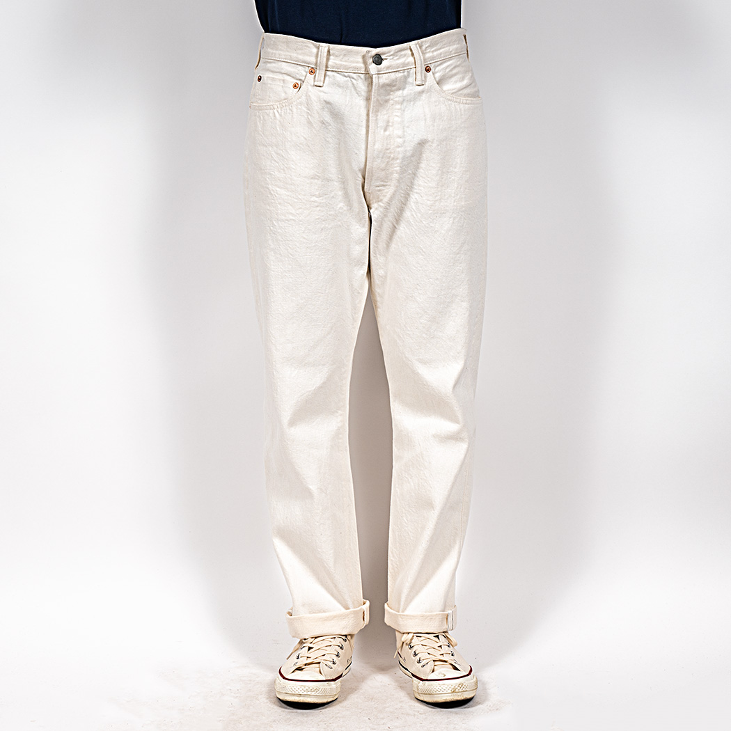 ホワイトデニムはインディゴやブラックに比べて固く感じます。サイズは、きつすぎないゆとりあるサイズを選んでください。
