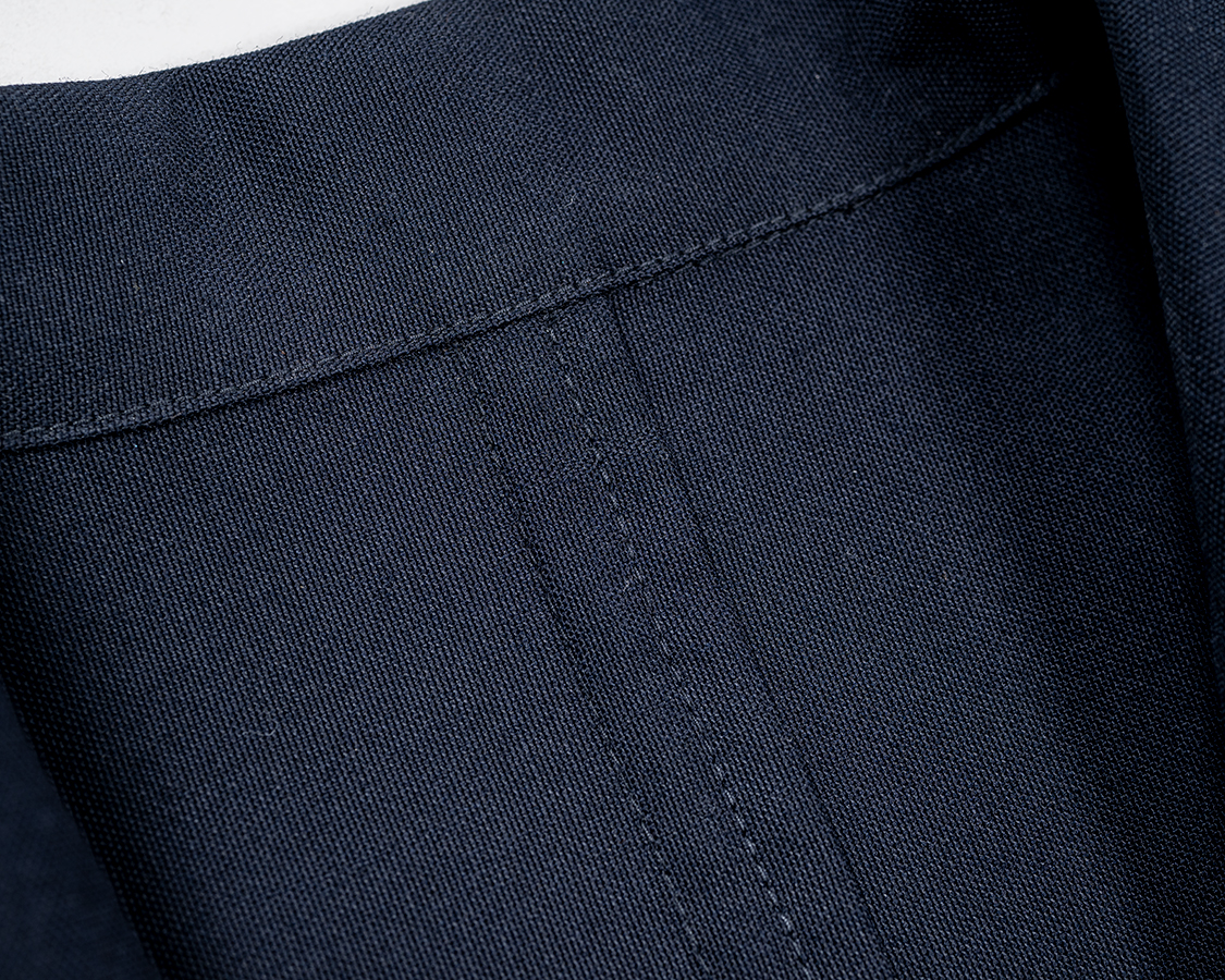後ろ中心の袋縫い。縫い代が完全に中に入って綺麗、かつ生地厚+ステッチで骨のような役目も。