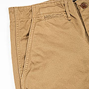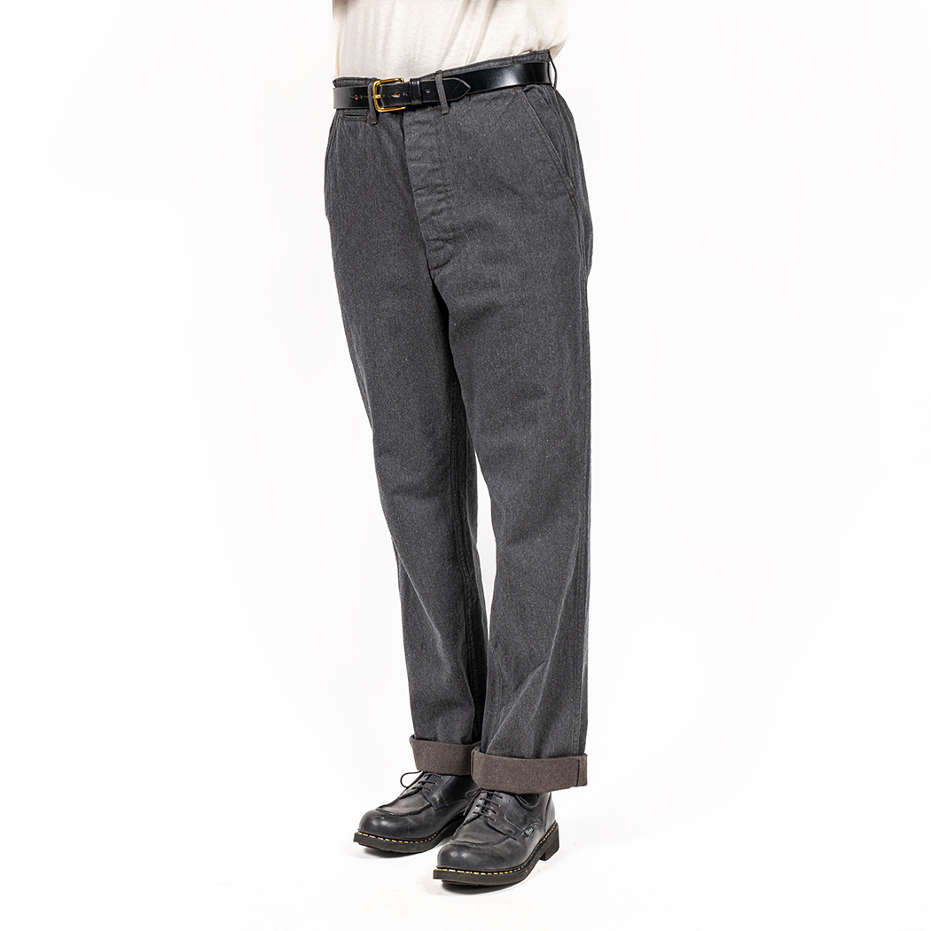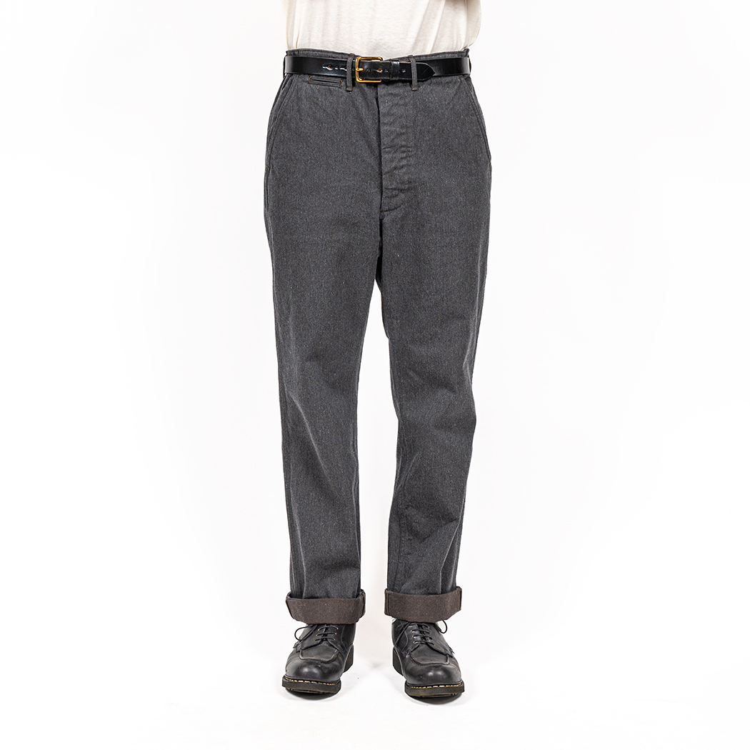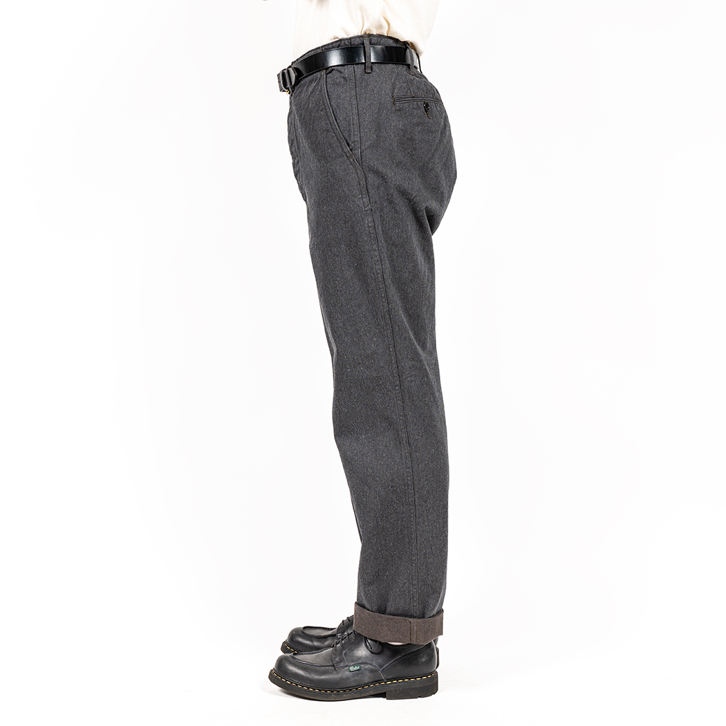 素材コットンサージはWORKERS オリジナル。タテ糸にワタで混ぜたグレー(トップ糸)、ヨコ糸に濃いブラウン。微妙にブラウンがかったグレーはめったに見かけない色合い。