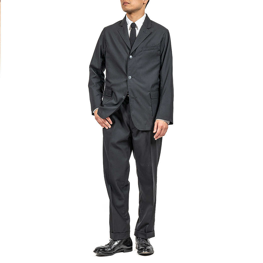 コンバットウール新色のブラックはアメリカ・ウォーターベリーの金属ボタン。やはり黒のトロピカルスーツ=ブルースブラザーズです。