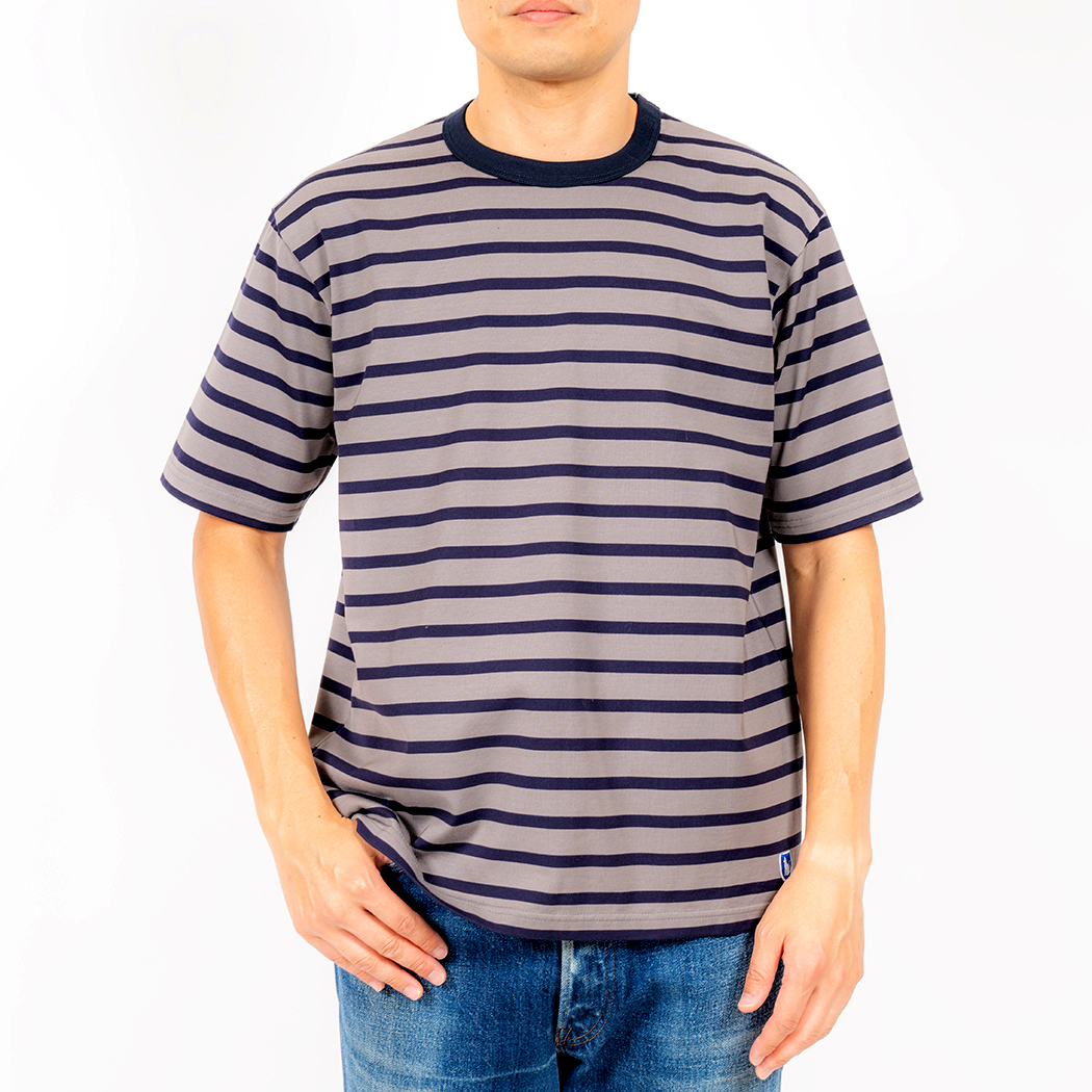 編み上がった生地をシルケット加工。アルカリ性の液体につけて表面をつるっとさせる。がっ しりして形崩れしづらい、かつ表面はつるっとしているので上にジャケットを着ても引っかからない。首のリブはがっしり厚い物にして、ボーダーの色部分が透けづらいように。