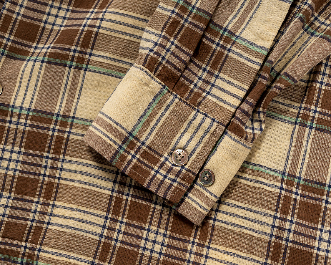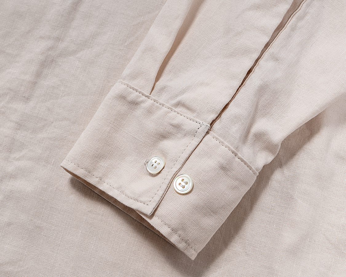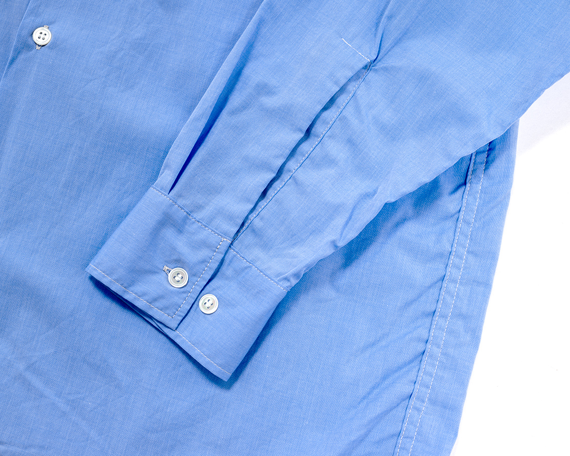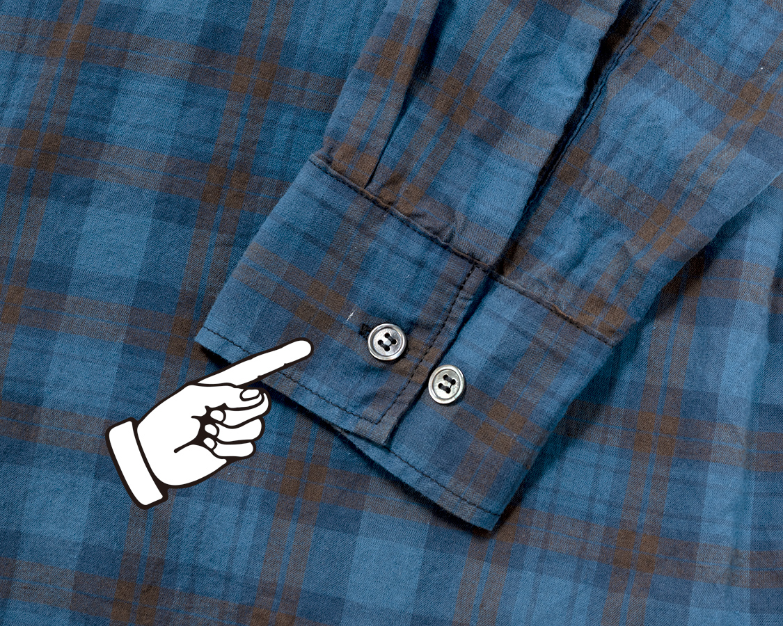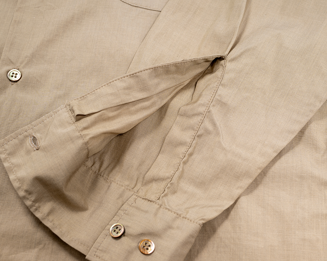 角型カフス+イッテコイ開き。袖に切込みを入れて、パイピング状に生地でくわえ込み縫い。このくわえ込み縫いするときに、切込みの奥まで「行って」「帰る」から通称「イッテコイ」と呼ばれる開き始末。