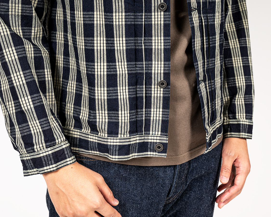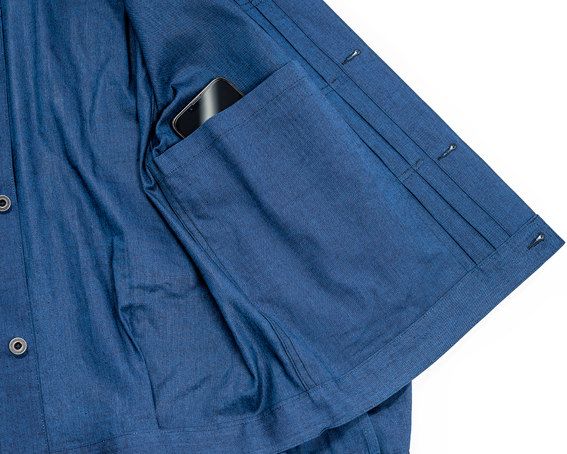 丈は63センチを狙いましたが、サンプルは縫いあがり62.5/洗いあがり61ほどの上がりでちょっとだけ短い。同じく、袖も短い。量産ではパターンを+2センチ程度して、Tシャツがぎりぎり見えるか・隠れるかのベストなバランスを狙います。
