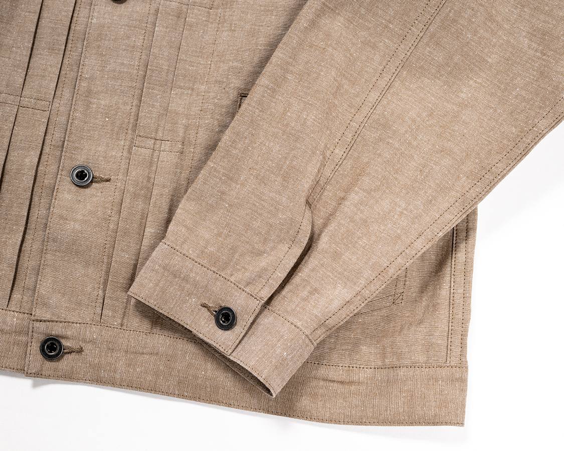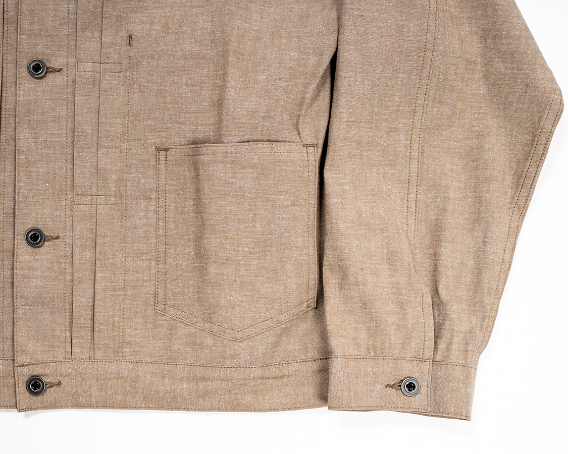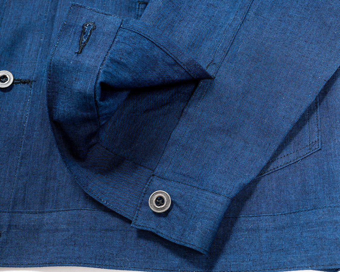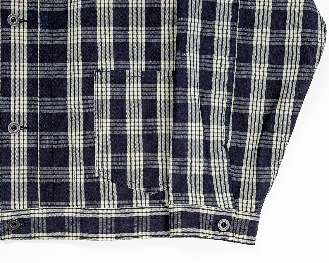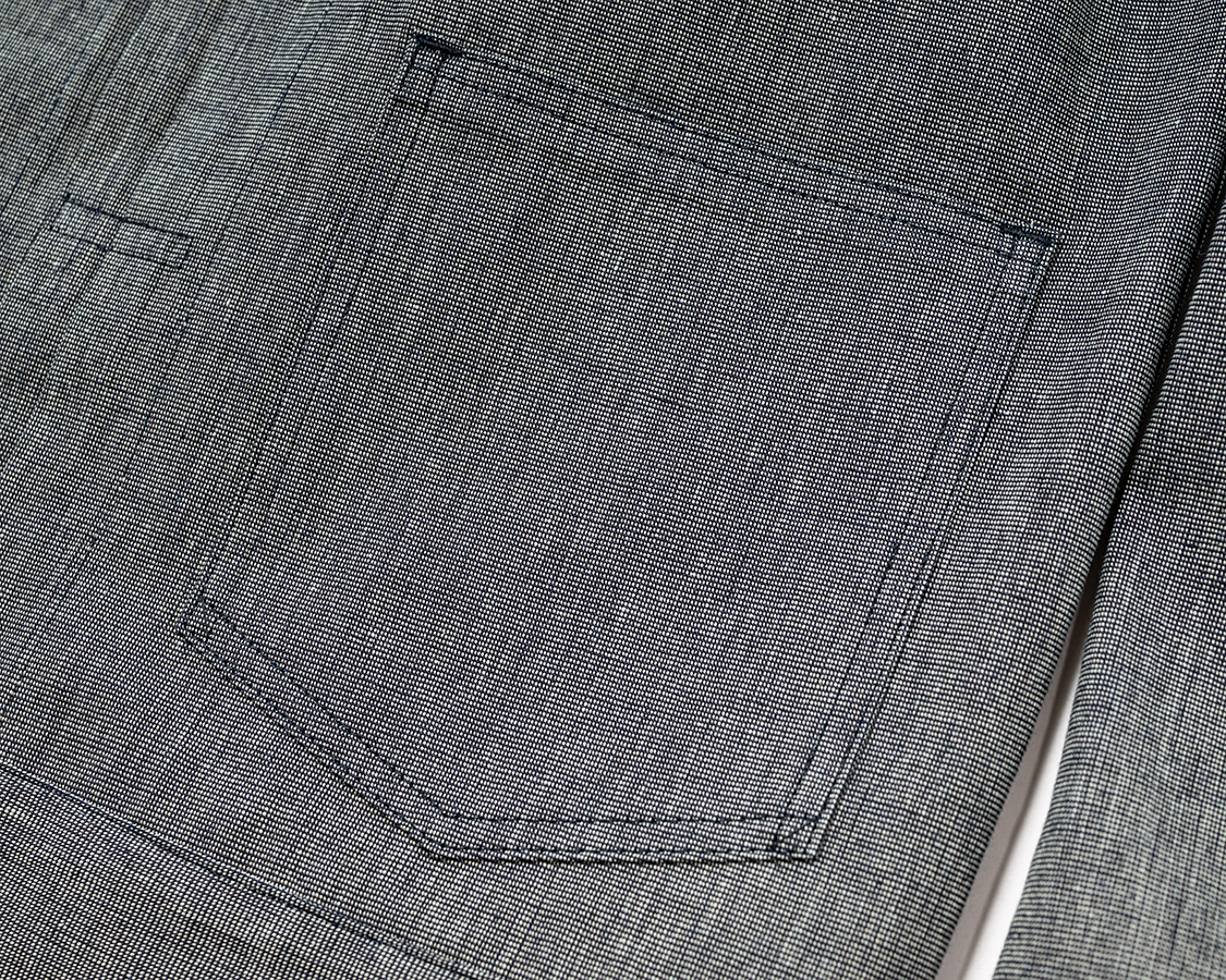 裾はまっすぐ。前下がりの無いパターン。私はカバーオールの型紙でついきつい前下がりをつけてしまいます。昔見た、ビンテージがそうだったのでつい真似してしまうのです。ただ、上背の無い日本人が着ると、どうしても、後ろ着丈に対して前が長く見える。Gジャン型のハオリが着やすいなと思ったのは、この「前下がりが無いから、前丈が長く見えない」が大きく関係しているように思います。