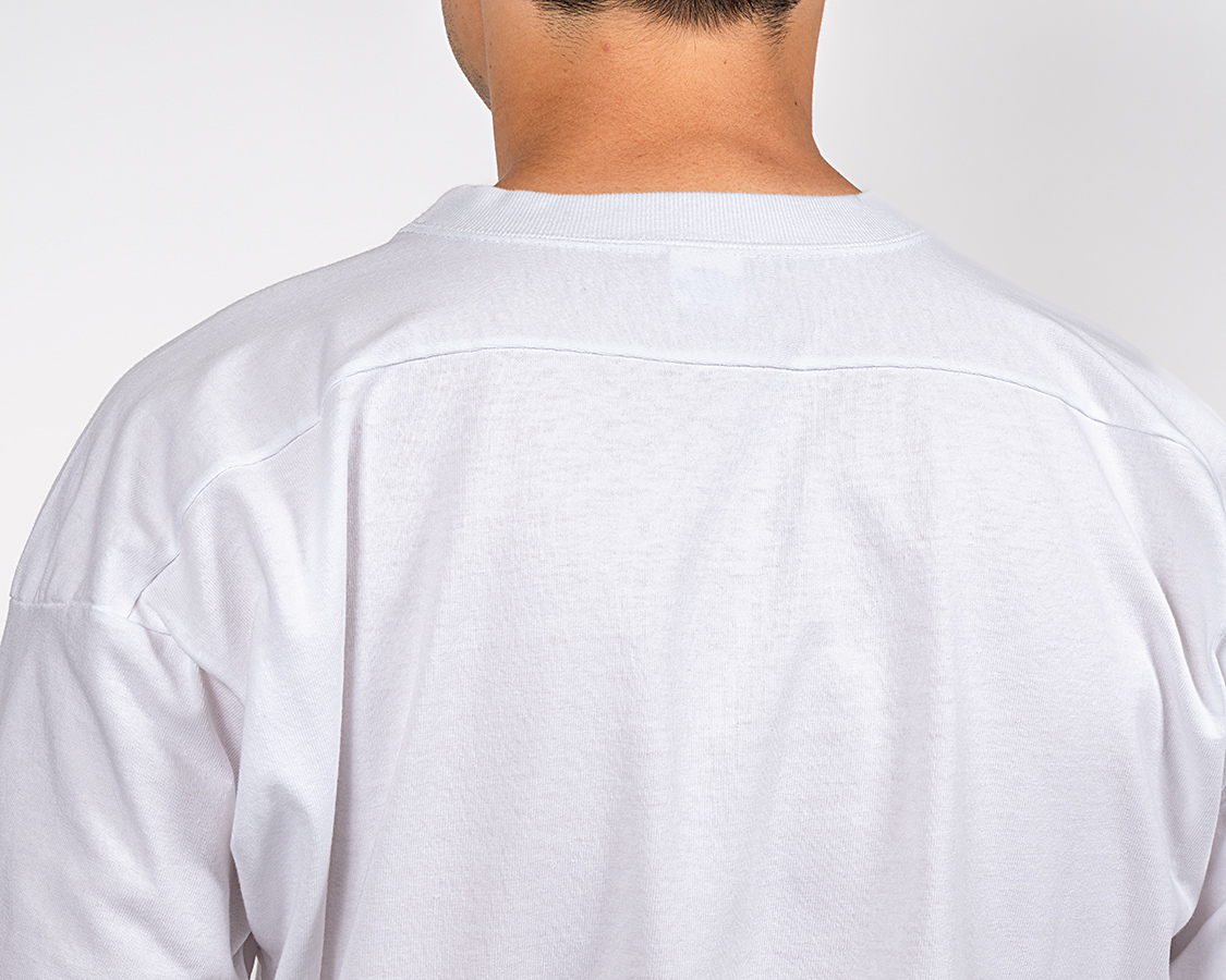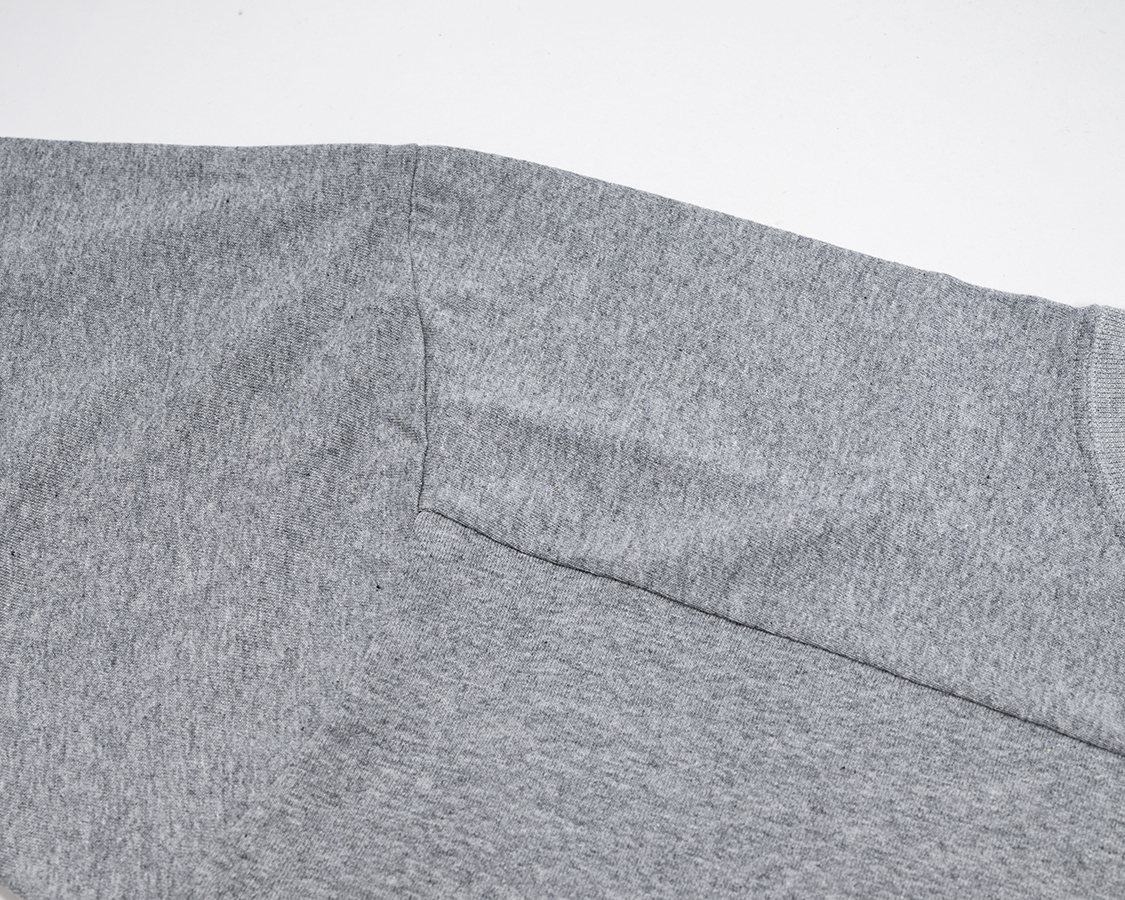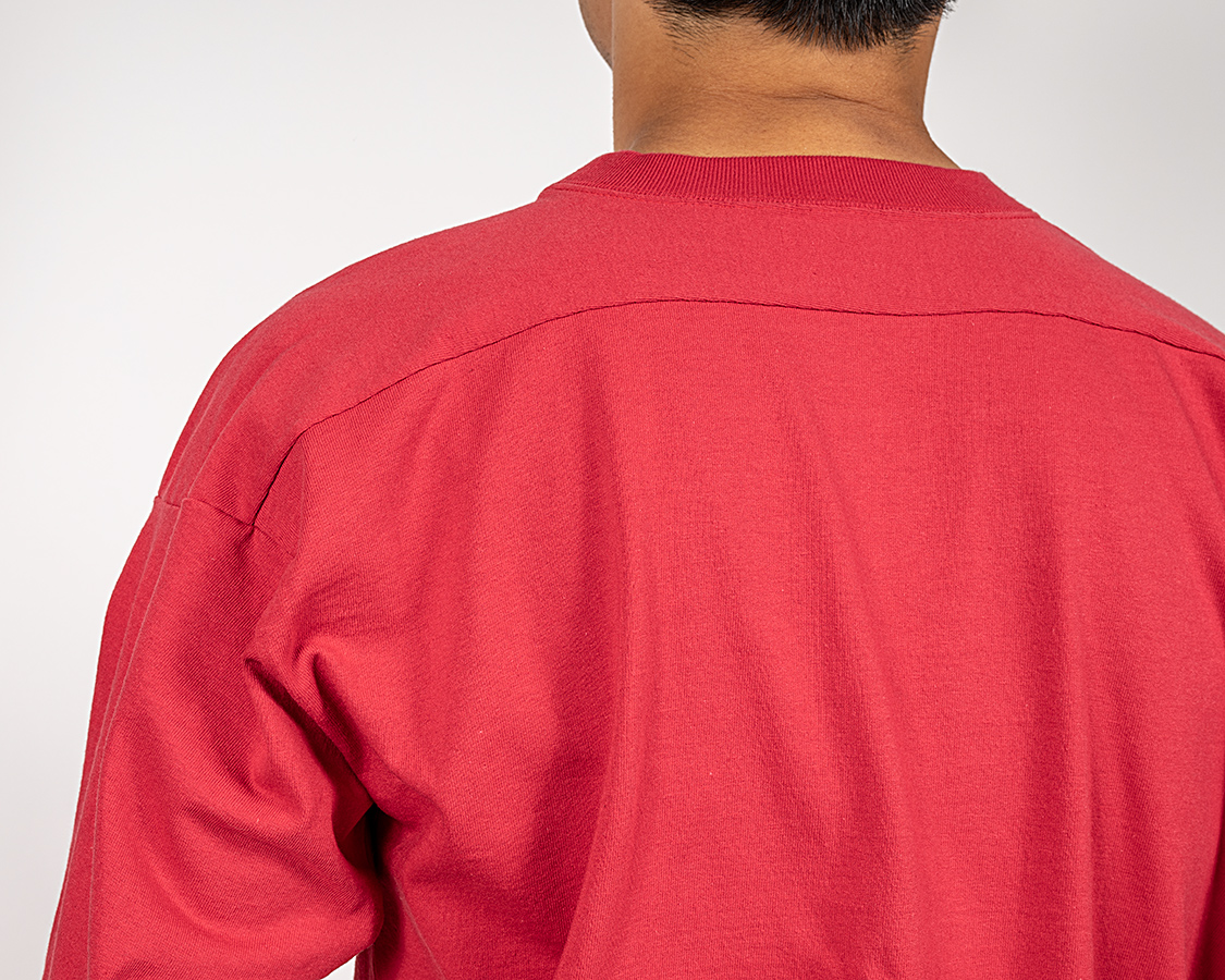矢印部分、糸がピョコピョコ出ているのは「天地」と呼ばれる始末。ダブルステッチが入る始末と雰囲気が違う。比較的古いTシャツで見られる仕様。
