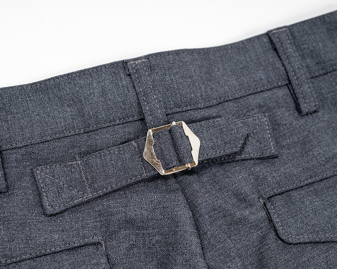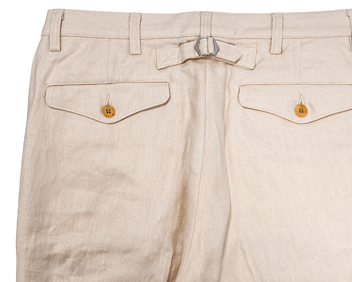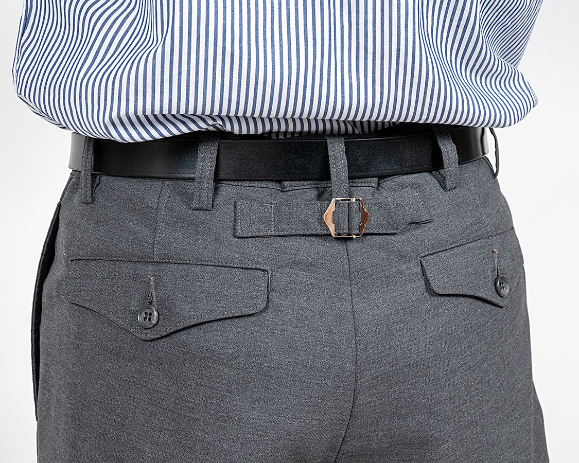 ダーツ・タックの無い軍パン(ベーカー)はウェストの調整ボタンや、極端に深いまた上を利用してゆとりを確保。