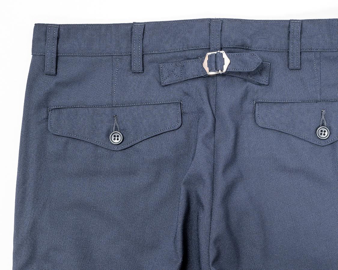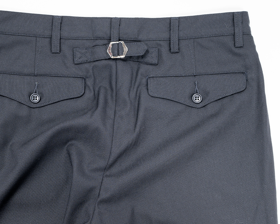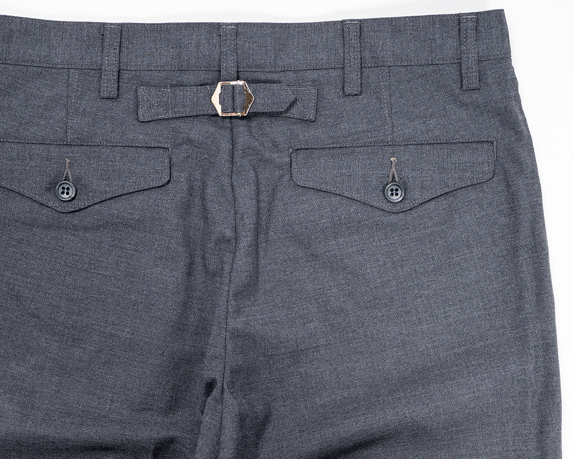 左右フラップ付きポケット。後ろ中心に尾錠。「これでもか」とアイビー的な仕様を盛り込んでいます。