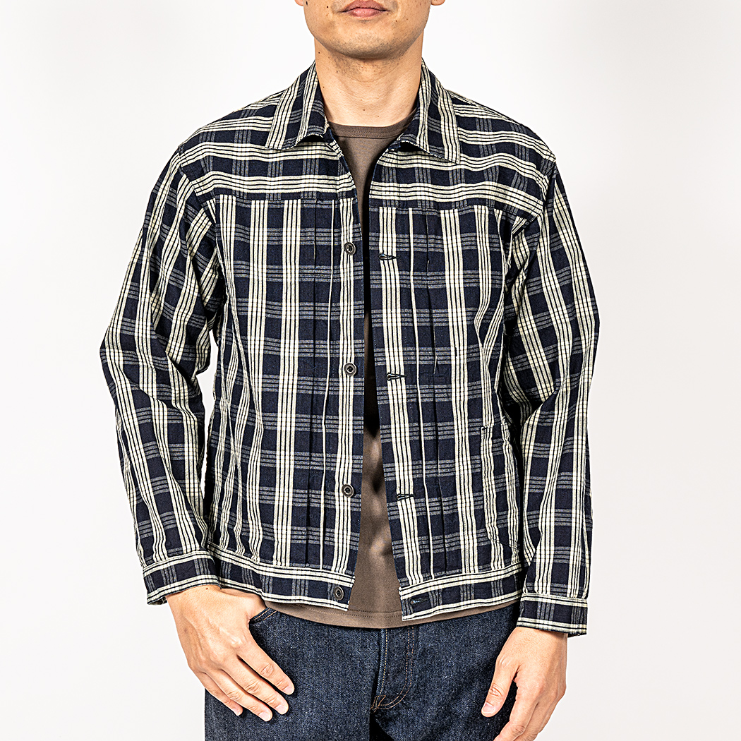 PincheckとPlaidは他のシャンブレー5オンスと比べると少し厚い7.5オンス。いわゆる「羽織もの」の厚み。インディゴ部分はこちらもロープ染色。