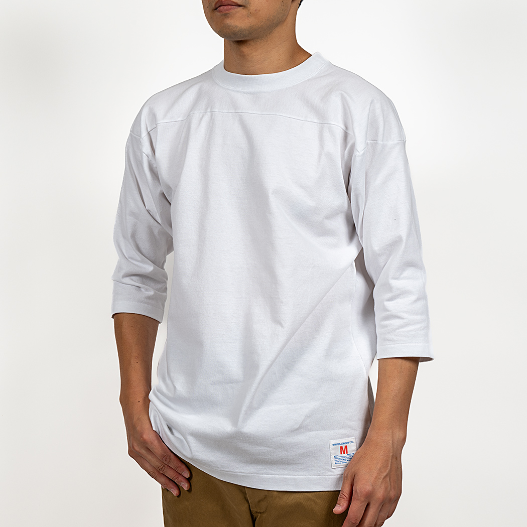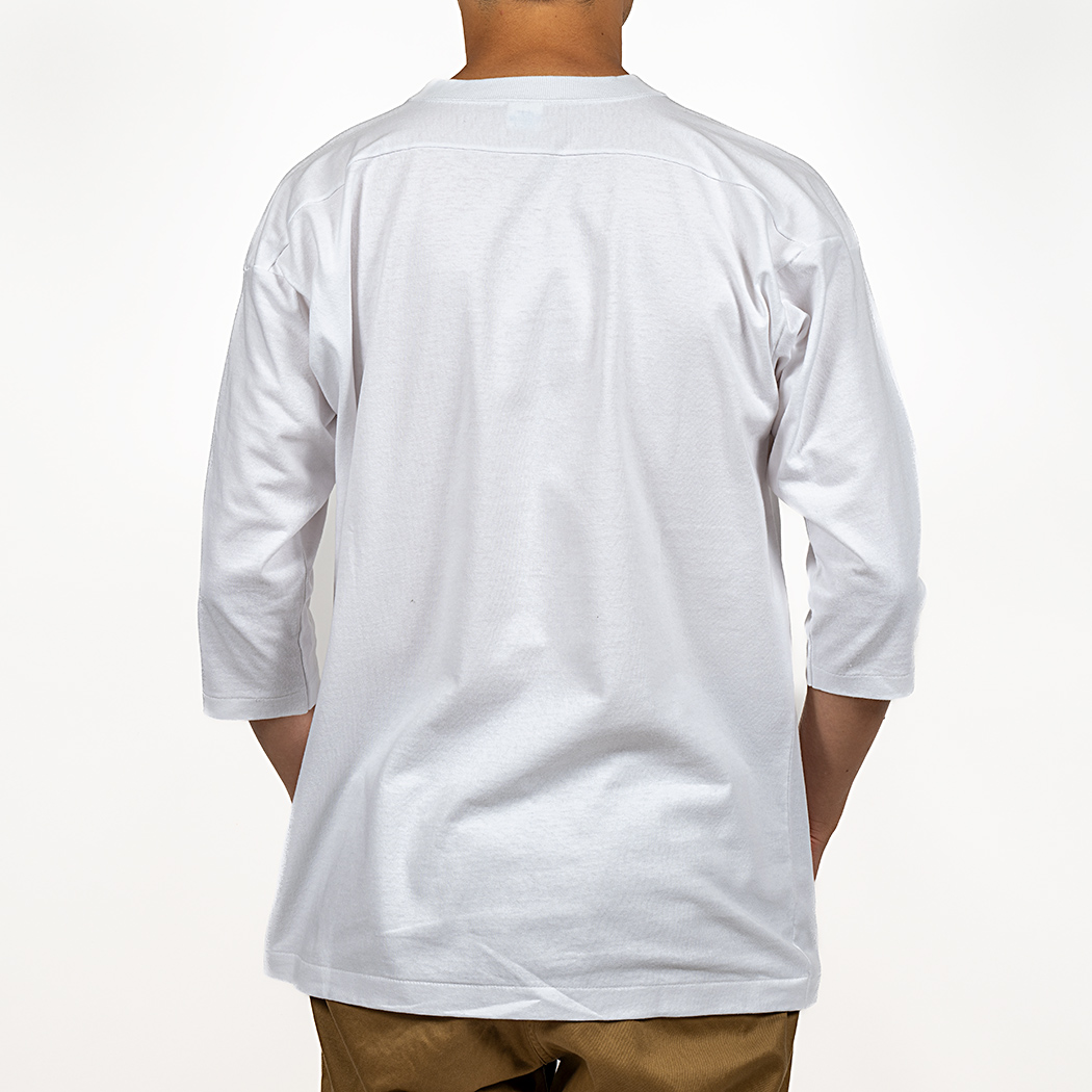 素材は16番単糸の天竺。7オンスなので、2PLYの5.7オンスより厚い、重い。ガサっとして固めの風合い。