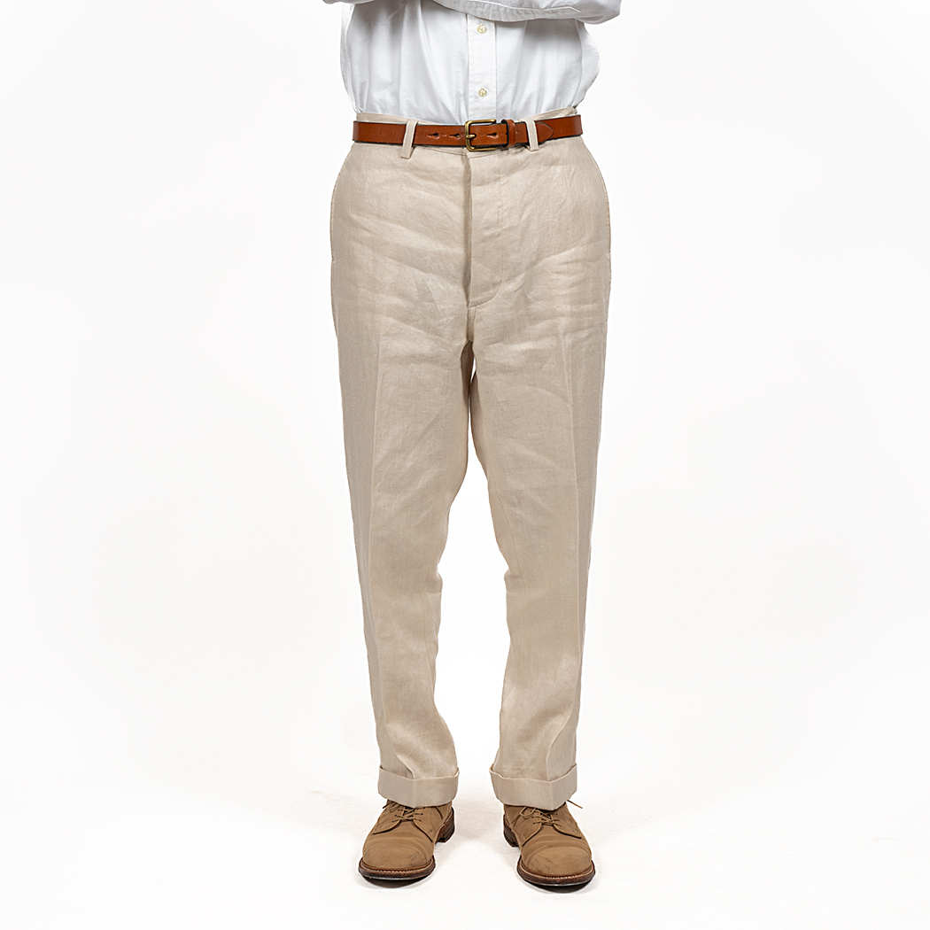 プレインフロント(前にタック無)、サイドの縫い目利用ポケット。バックシンチにフラップ付き玉縁ポケット。これでもかと「アイビー」らしい仕様を盛り込みました。