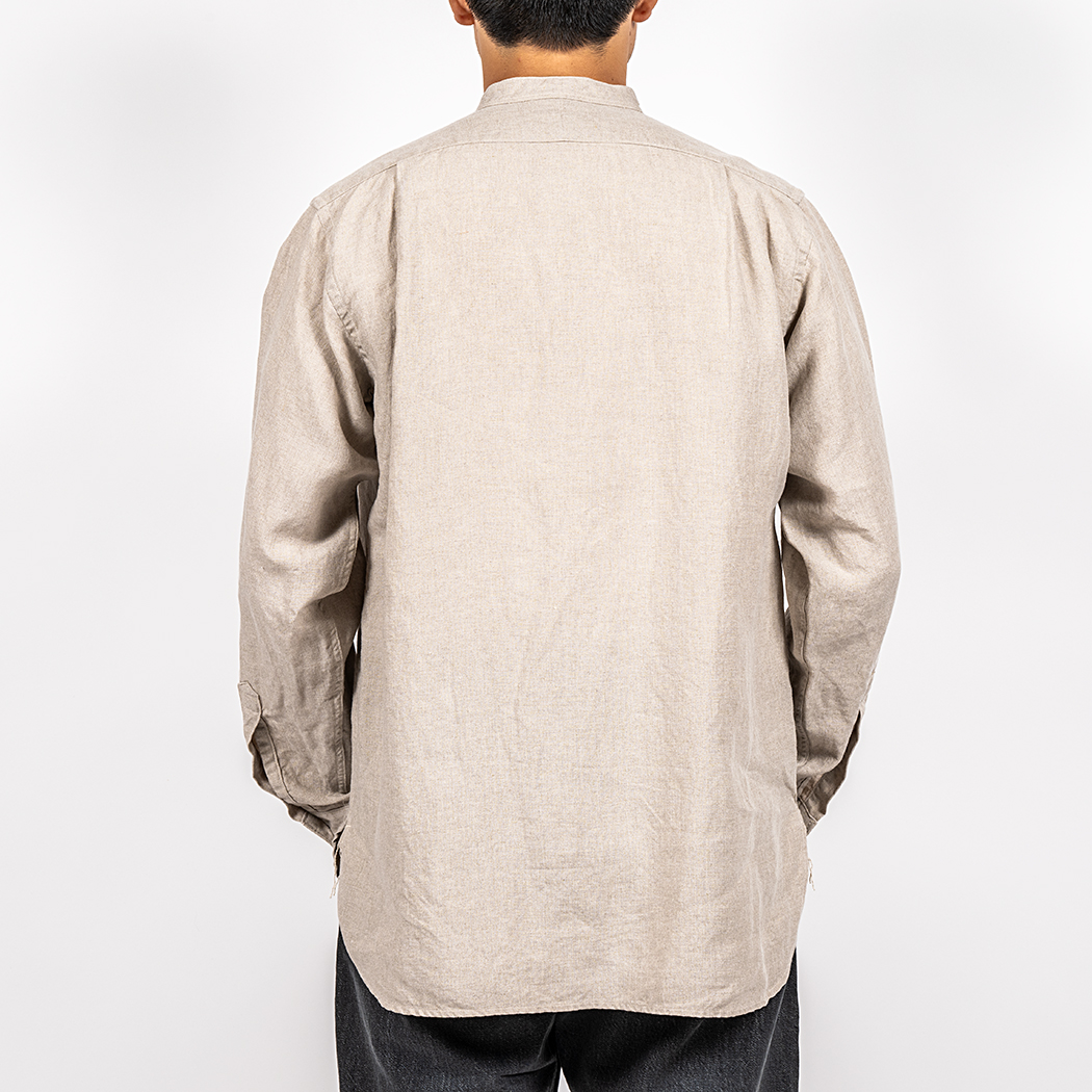 形はおそらくイギリスミリタリー物と思われるバンドカラーシャツから着想を得ました。着丈はオリジナルが80センチを超えるところ、WORKERSは76センチ程に変更。裾を出しても、入れても着られる、WORKERSが考える「Modified」な着丈。