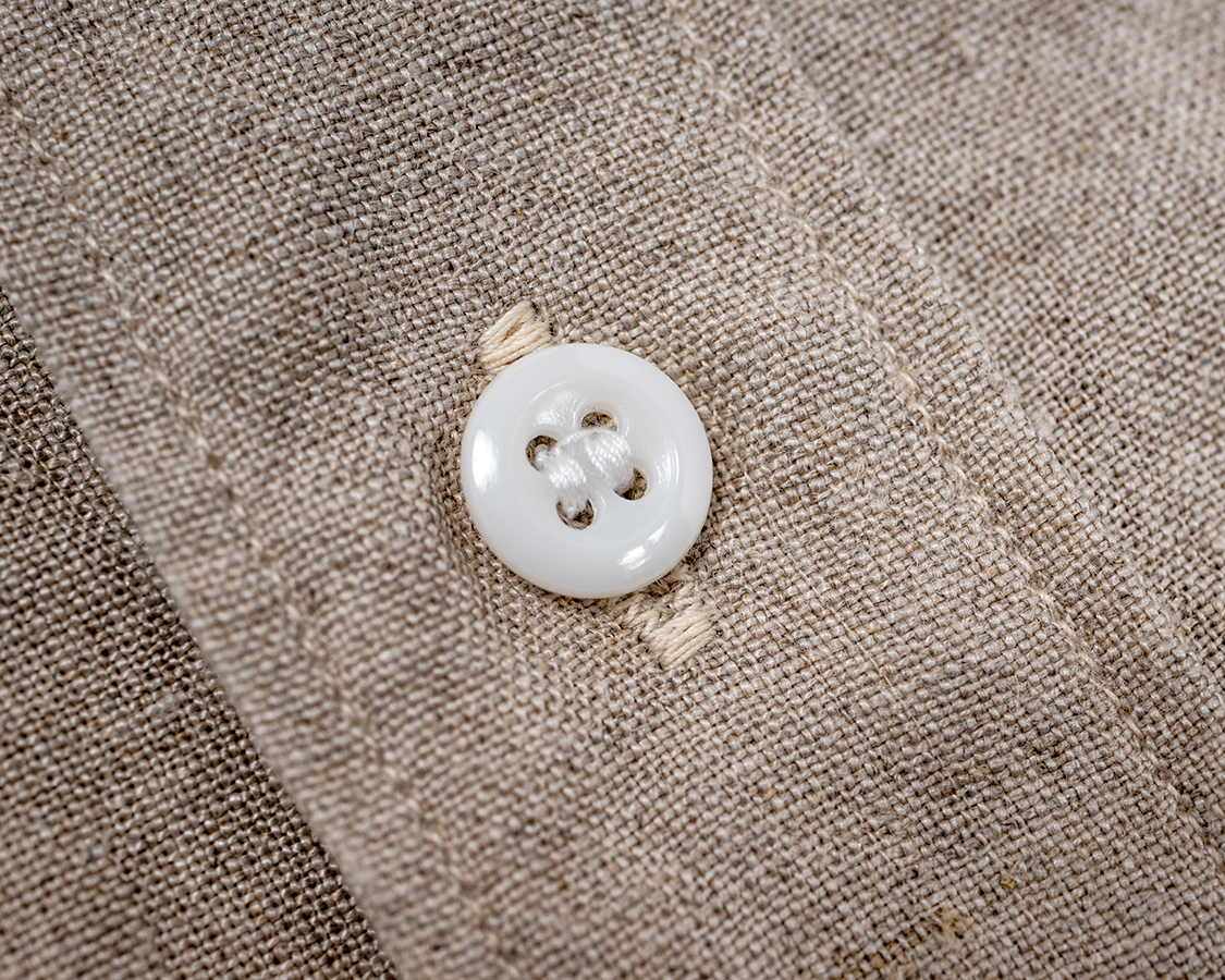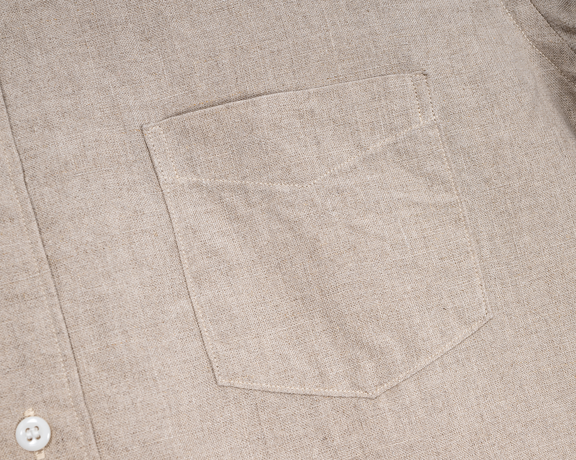 襟型が悩んで、ボタンダウンは違うしレギュラーカラーも、ラウンドカラーも違う。台襟はありつつ、羽襟は四角い、「スクエア」な形で、台襟までボタンを締めるとちょっとワイドスプレッド気味。これはもう好みです。単純に私が好きな形。