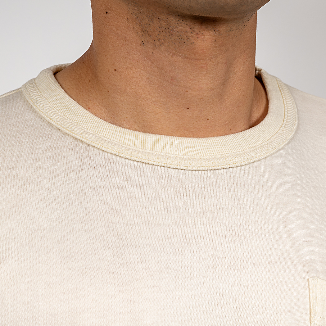 着脱ぎを繰り返すので、首がとにかくしっかりしていないといけない。そこで、首はバインダー。首回りの身頃を、別の フライス(リブ)でパイピング状に巻く始末。さらに、そのバインダーを2 階式、ステッチが落ちるところで生地が2 重・ 2 階建てになっている。生地を折り込んでいく金具を別注で作らないと出来ない。工場さんから「金具代出してくれる?」 と言われましたがもちろんOK。自分でただ、作りたいように作ったT シャツです。高くてすいません。