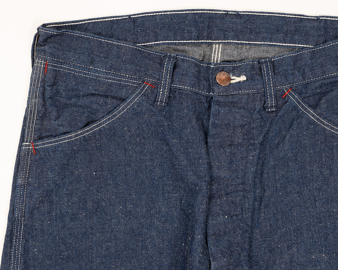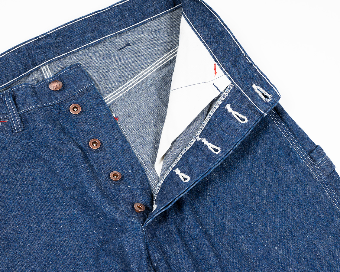 フロントボタンフライ。ヒヨクを見返しに止めるぐにゃぐにゃステッチあり。ここはヘラクレスの古着を見て真似したところ。