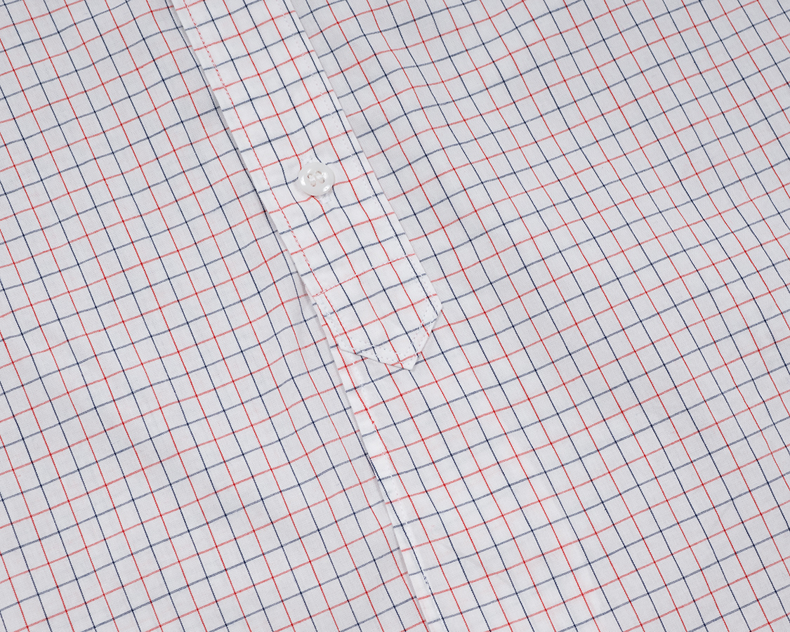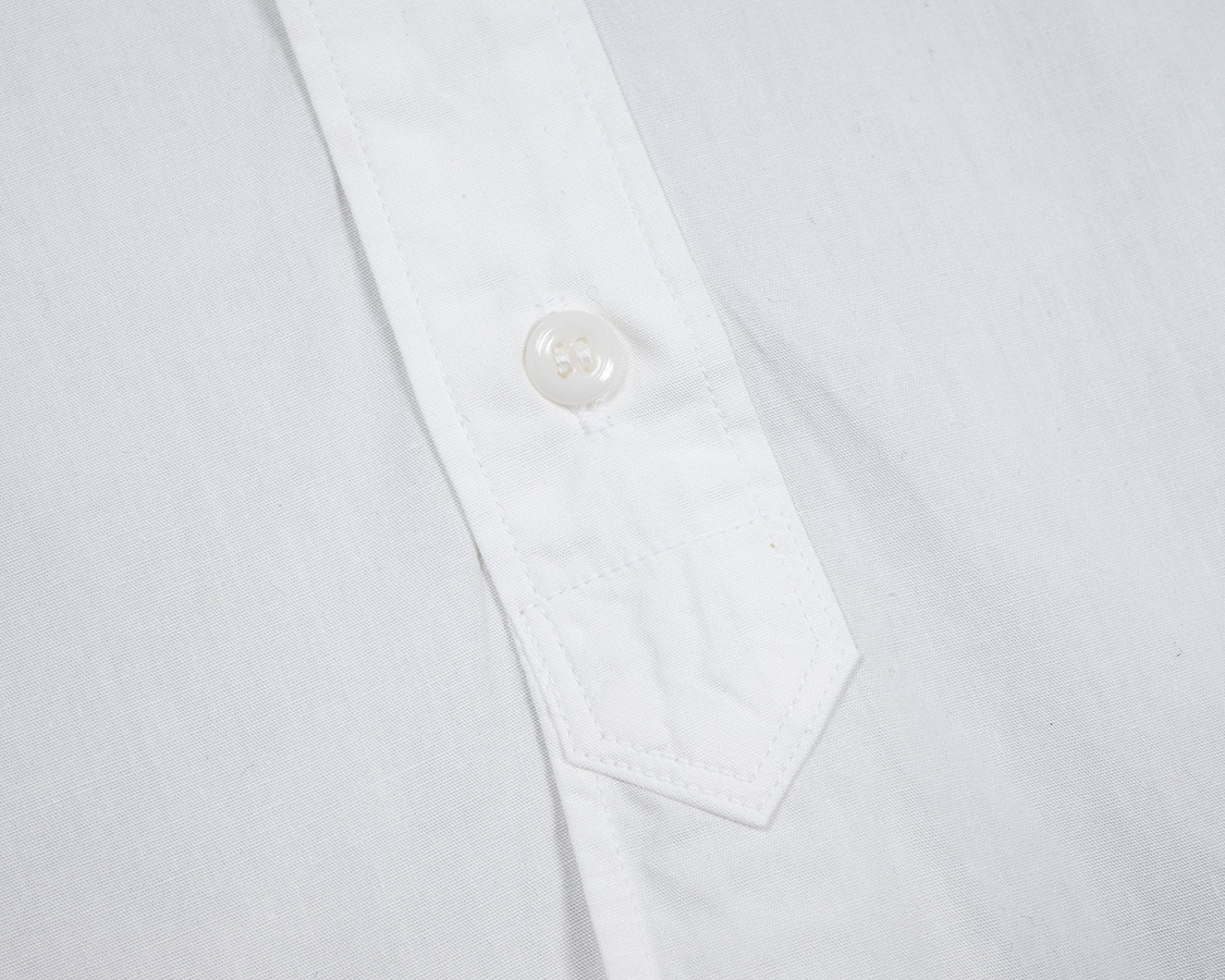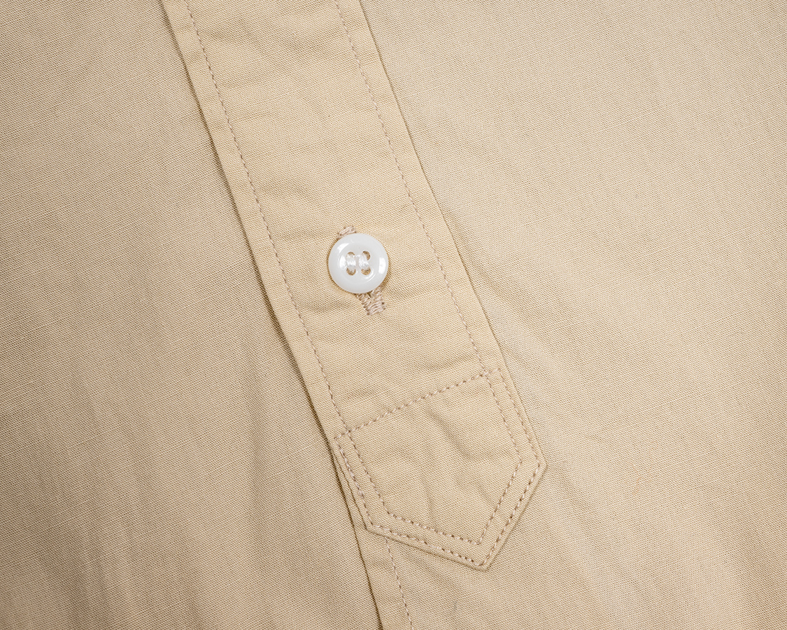 フロント一番下の始末。もともと、イギリスのミリタリー?らしきシャツでこの始末を見つけて再現しています。いわゆる「クラシックなシャツはフロントの裾部分が丸みがあって、下着の代わりに」云々というデザイン。理由は本当かわかりませんが、確かにクラシックなシャツでは見るデザイン・始末。