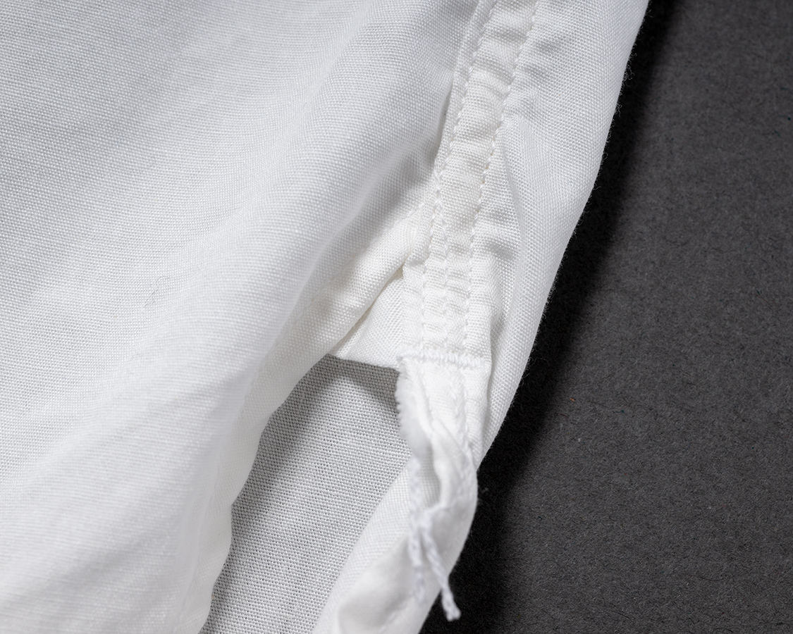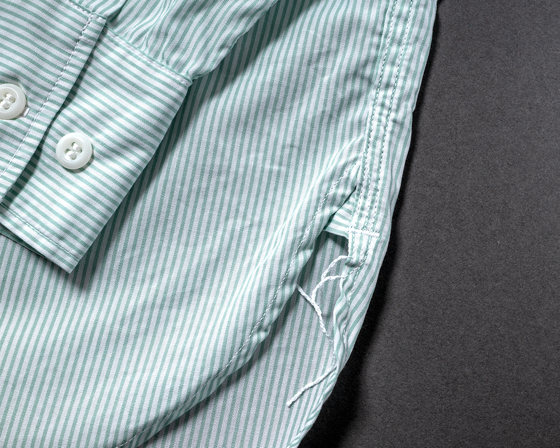 脇はマチ+ほつれ止め閂始末。いわゆるふる~いシャツの仕様。先に裾を始末してから脇を縫う。2010年ごろ、皆、やっきになってこの仕様をやってました。あの人たちはどこへ行ったのか?今でもちゃんとやってるのはEGぐらいです。やっぱり、一本筋が通っているブランドは時代に合わせるだけでなく、やることはやるのです。